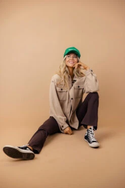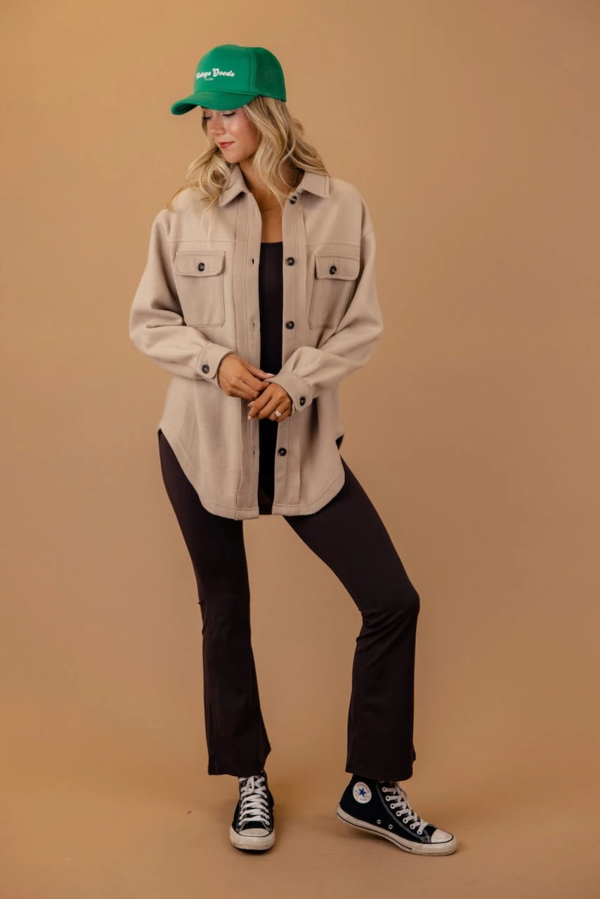 // paired with the fire and rain fleece coat, vacation club canvas trucker hat in darkgreen, lucien patch pocket shacket, + vintage goods foam trucker hat