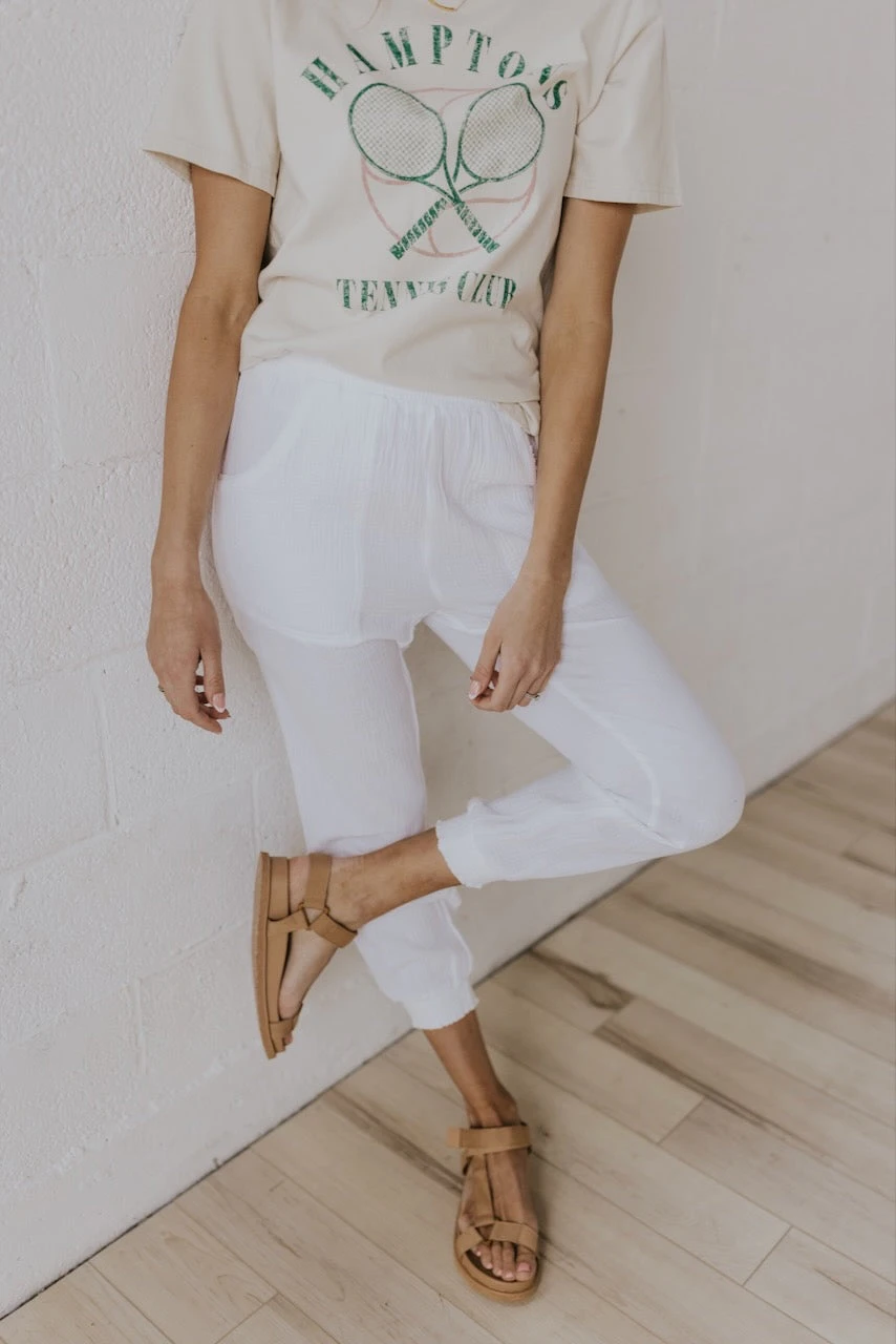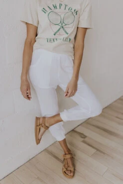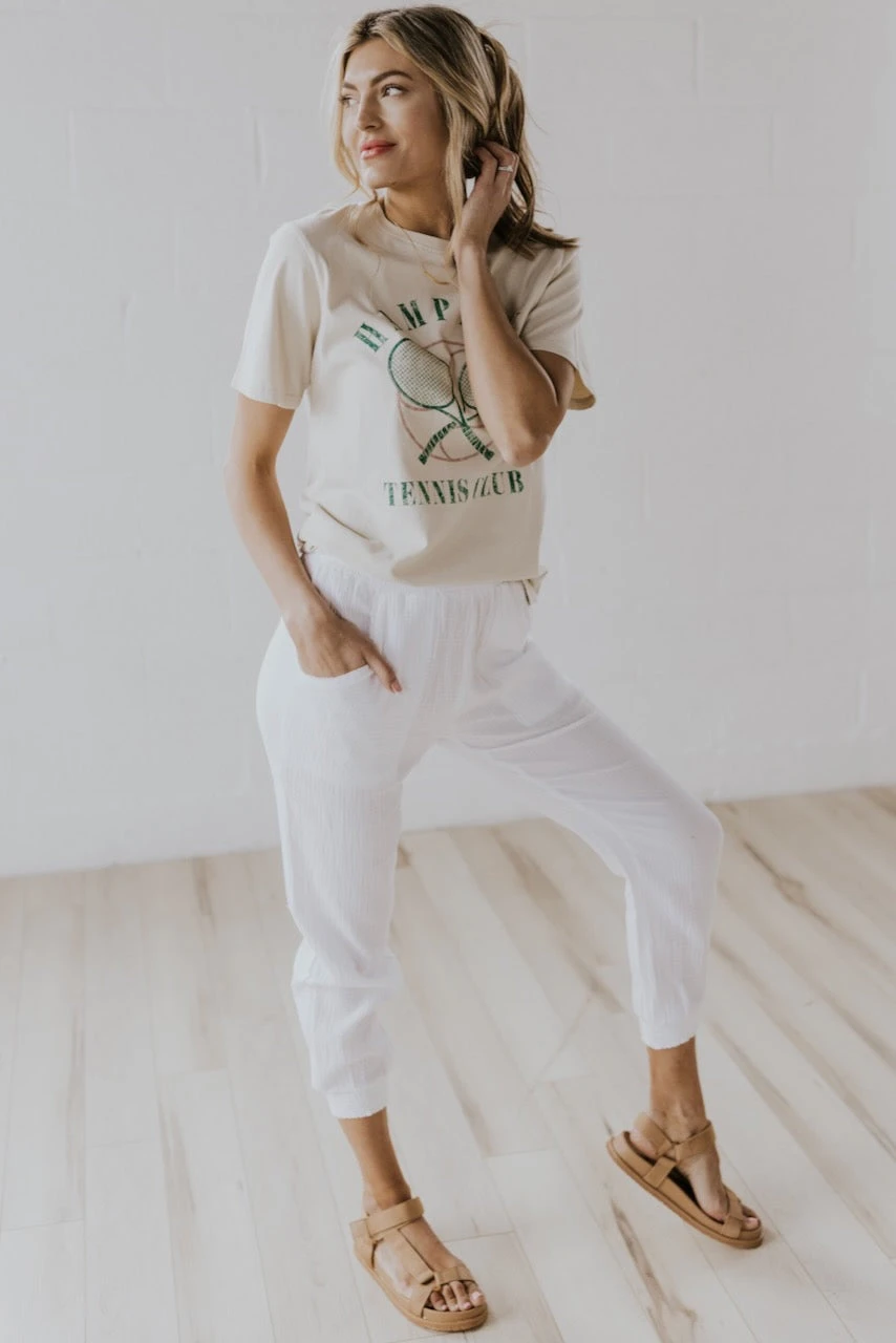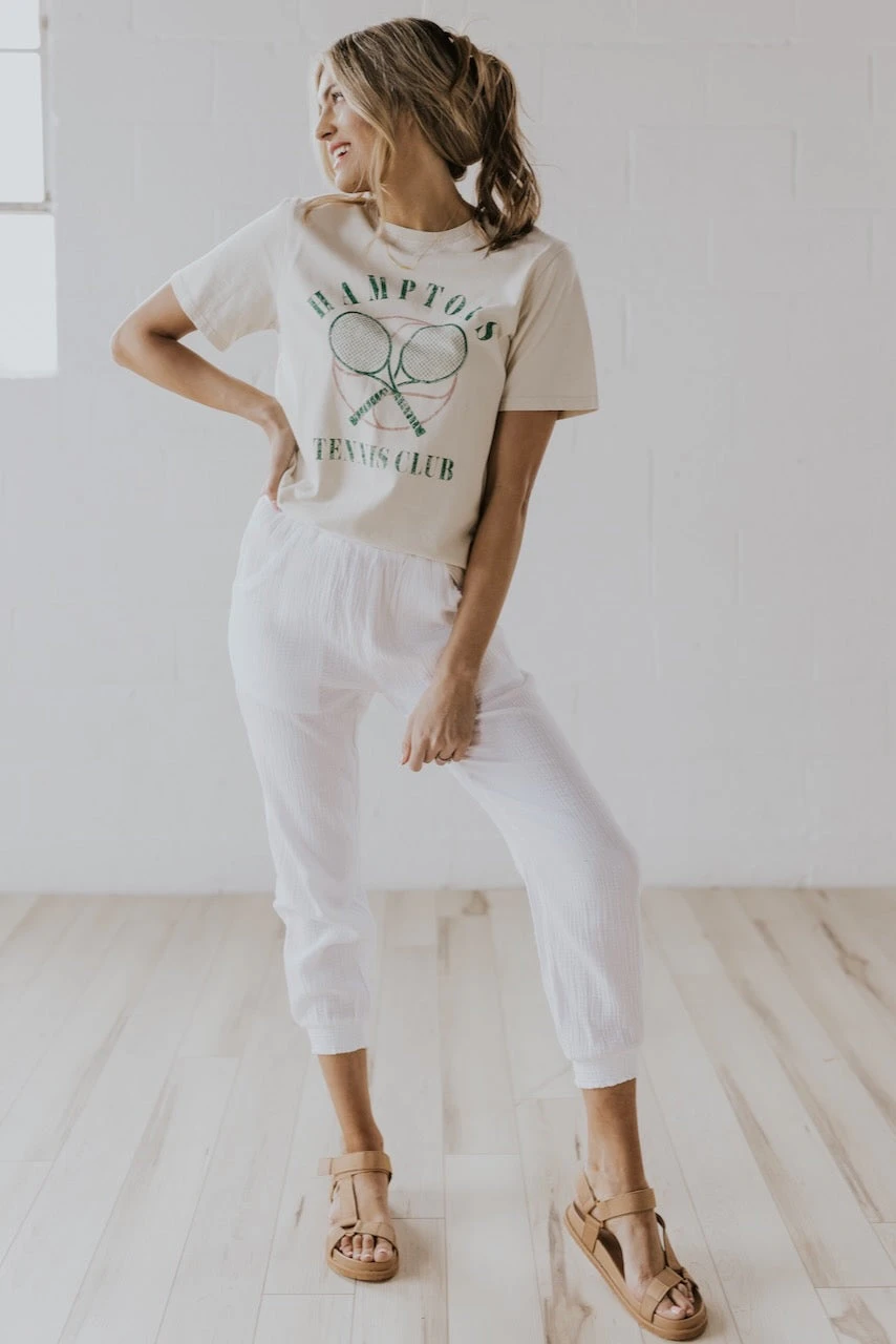 // paired with our hamptons tennis club graphic tee + roolee kaori sport sandal in burlywood. also paired with a swimsuit coming soon