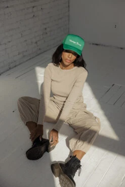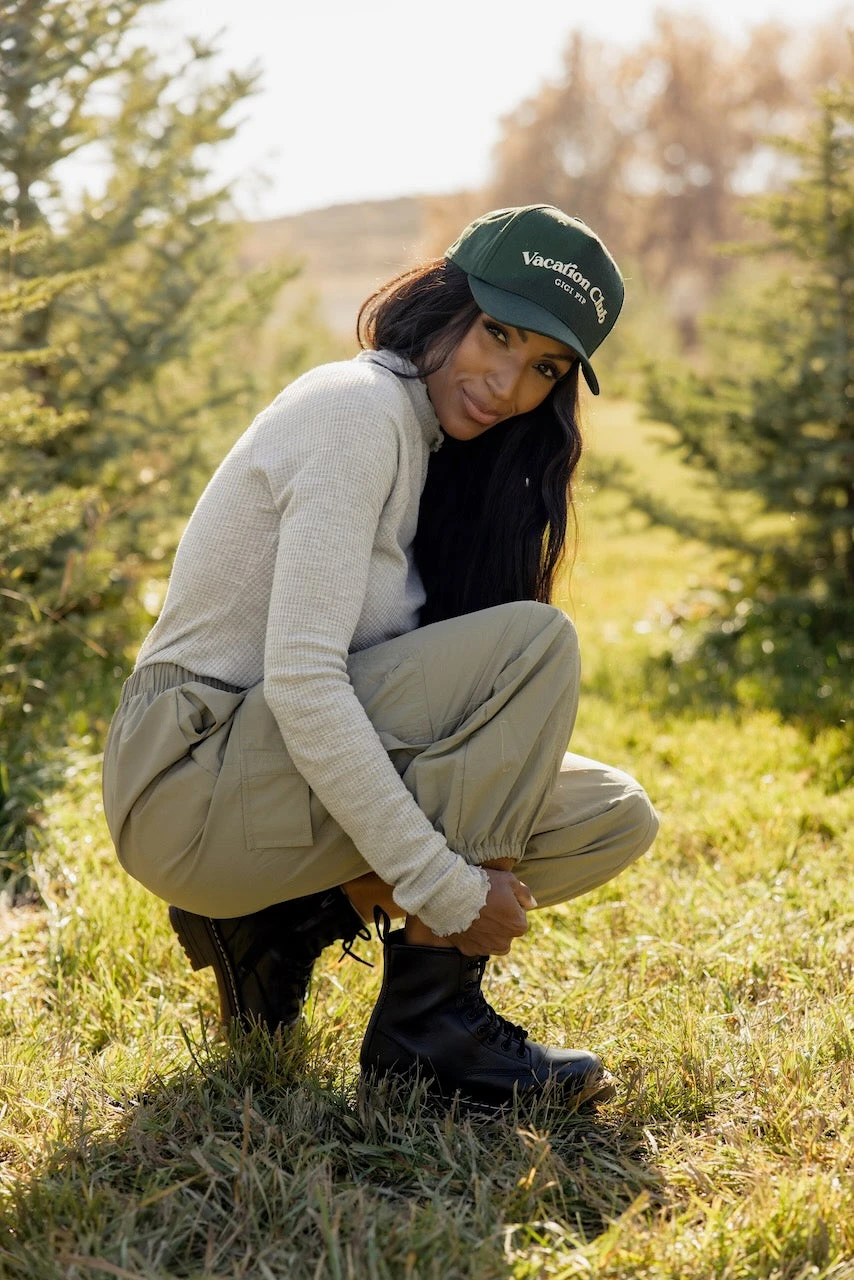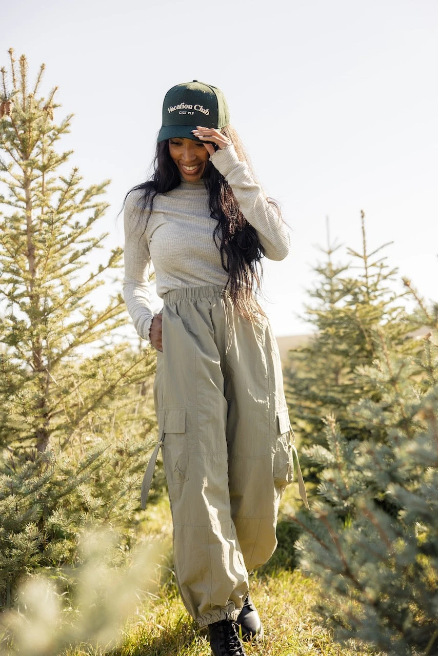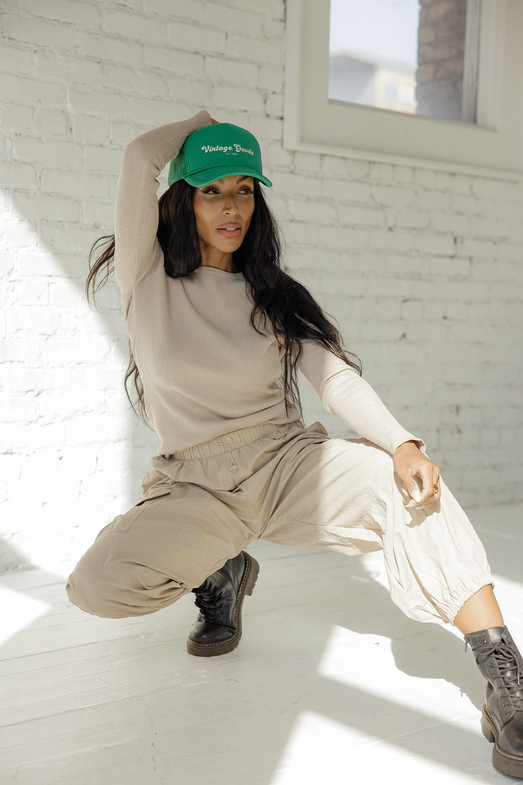darkseagreen // paired with the free people make it easy thermal, vacation club canvas trucker hat in darkgreen, + roolee elvis platform boots in black