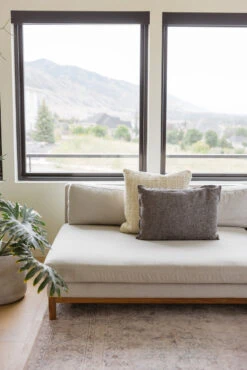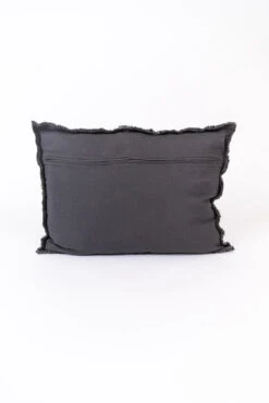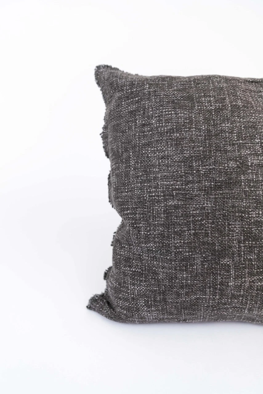 This dark grey pillow features a slightly lumbar shape, frayed edges, and linen blend fabric. The perfect little pillow to spruce up your space. Great for you bed, couch, or armchairs!