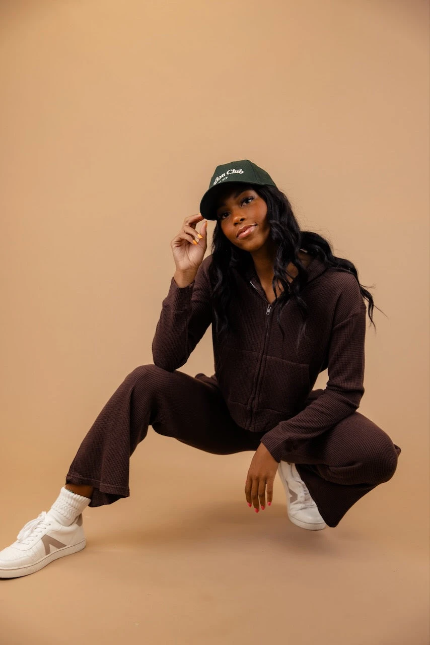 // paired with the elain classic waffle jacket, vacation club canvas trucker hat in navy, saddleback ranch foam truker hat, just like this long sleeve, + mia crew casual sneakers in burlywood and silver