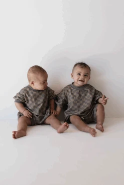 Introducing the Faded Brown Checker Board Two Piece Sweat Short Set! Stylish and comfortable for kids ages 0-9, this set features a trendy checker board design that will make any child stand out. Perfect for any occasion, this set offers both fashion and functionality. Upgrade your child’s wardrobe today!