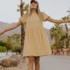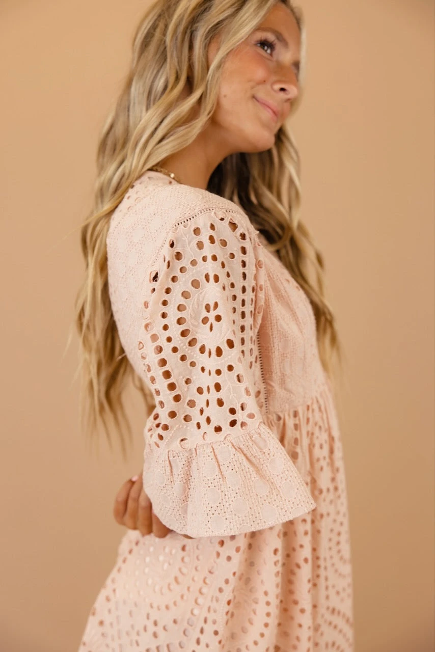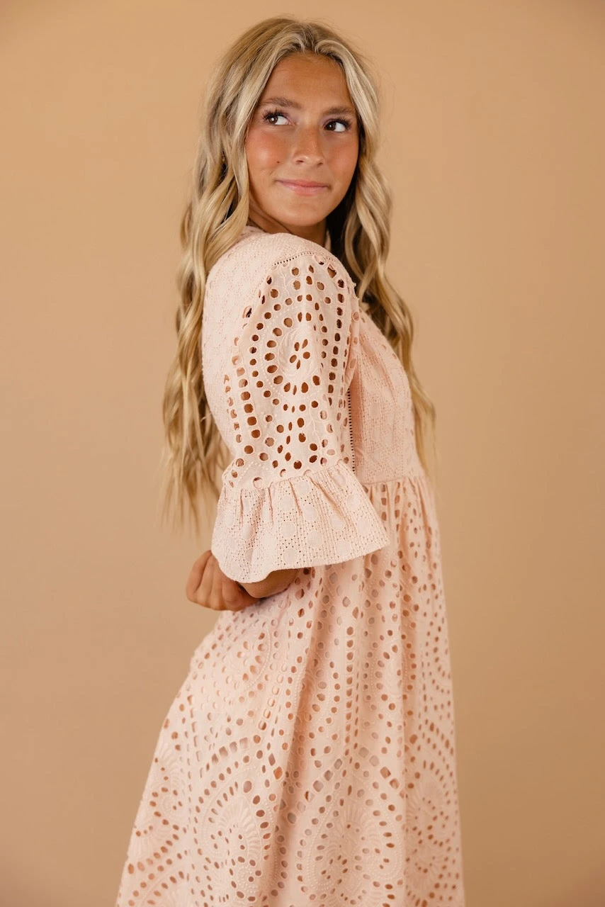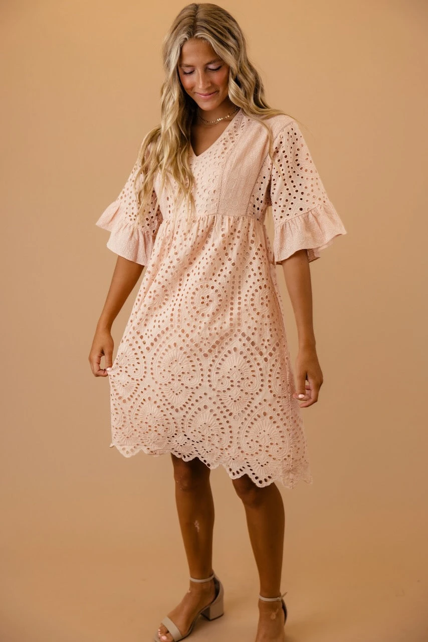 We fell hard for this beautifully detailed eyelet lace dress! This modest, blush dress is designed with a curved v-neck, bell sleeves, a gathered, empire waist, and a scalloped hem.