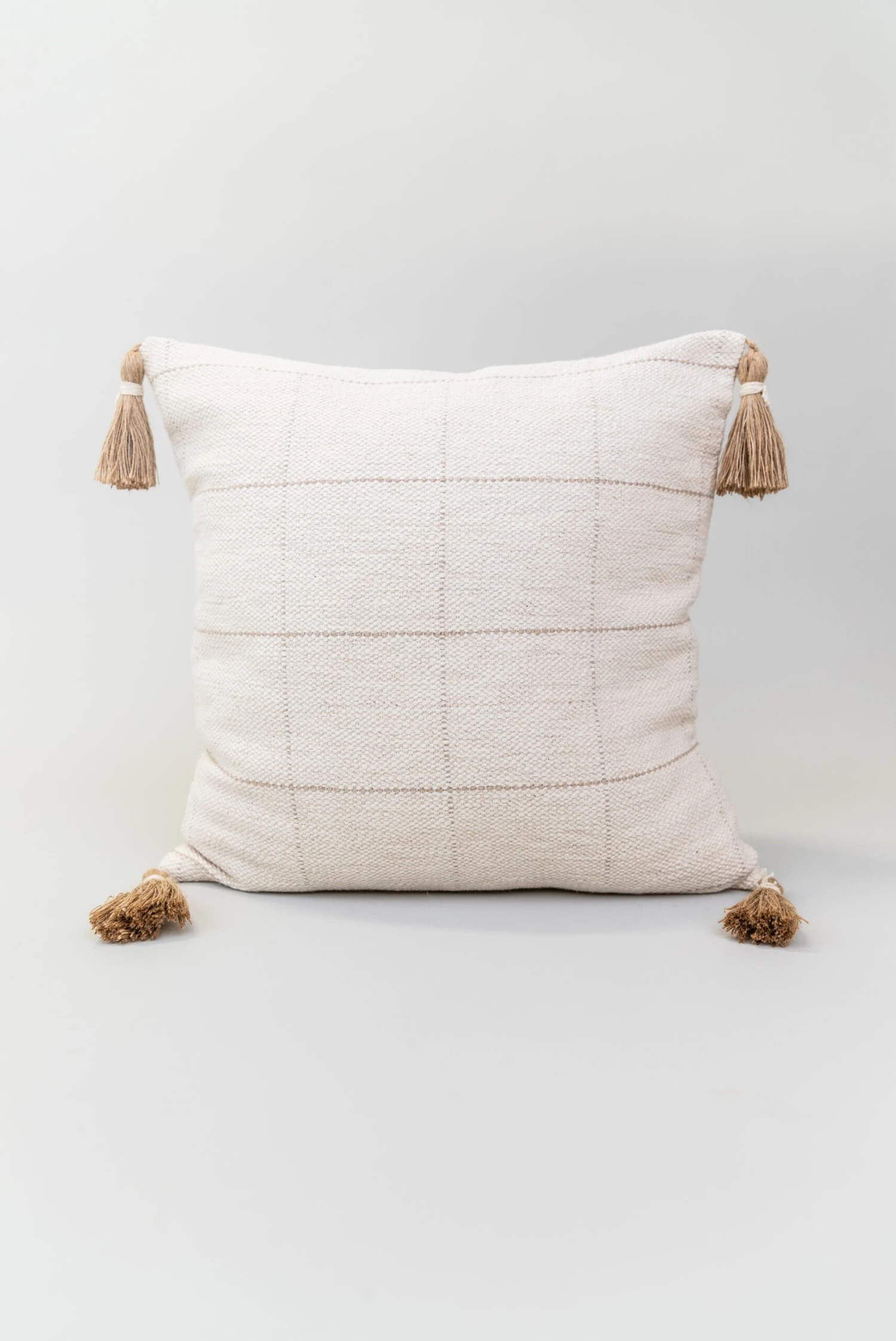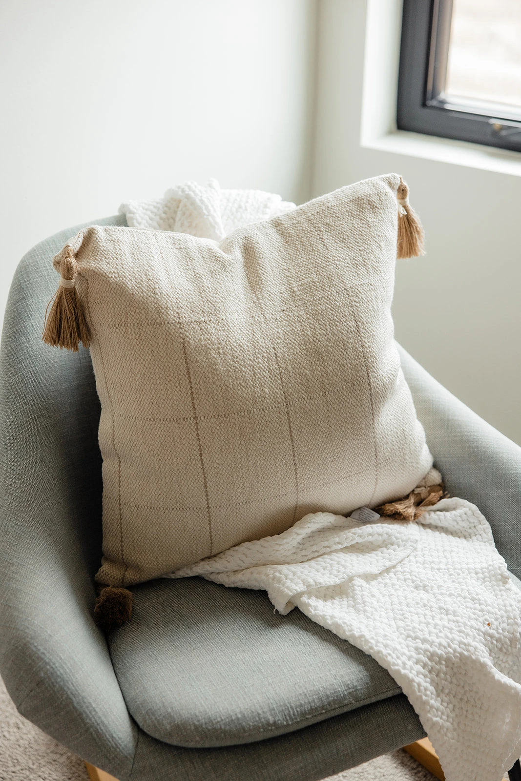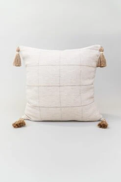 Introducing the Finch Tassel Pillow – a charming addition to your home decor that brings both style and comfort! Featuring a playful grid design and adorable tassels on each corner, this pillow is sure to add a touch of cute sophistication to any room.