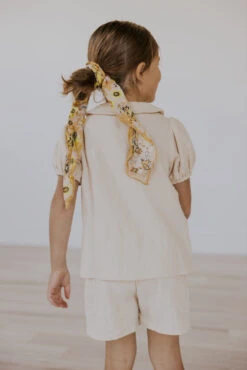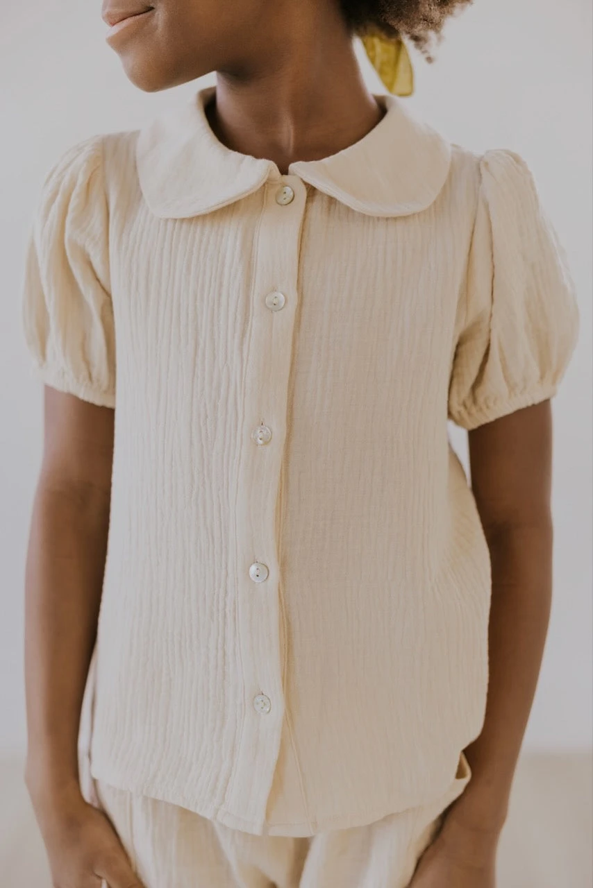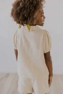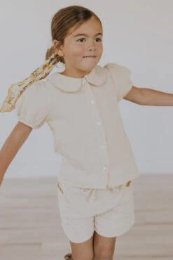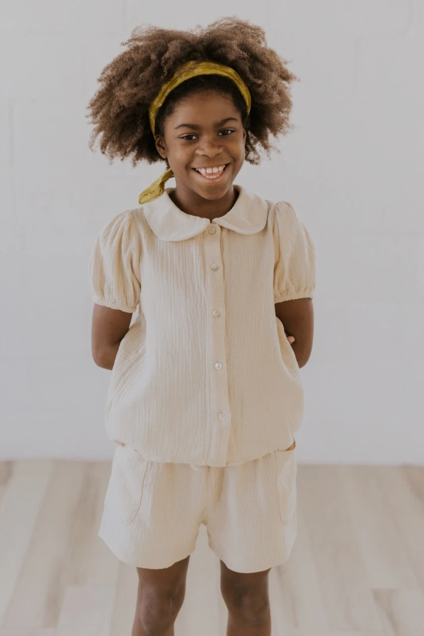 Oh ya. This blouse is for real life. Featuring a button-down front, an eye-catching Peter Pan collar, + puff sleeves. Pair her with the matching shorts or leggings for a beautiful spring outfit fit for picnics, family events, or school. Don’t forget to tag us when you do 🙂