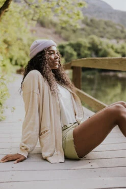 // paired with the penny distressed shorts, the stuck in your head ribbed beanie, + the pisces waffle knit long sleeve