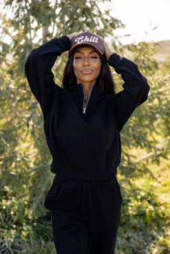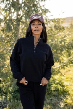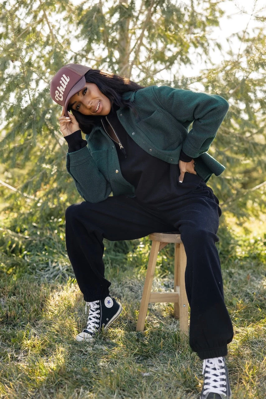 black // paired with the after the storm wool shacket + chill foam trucker hat