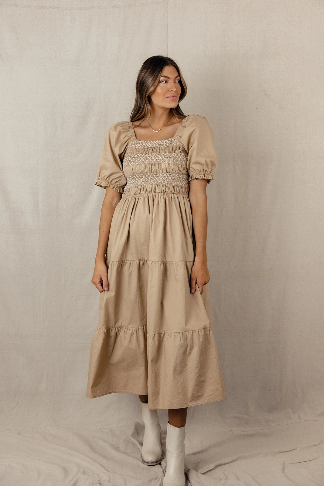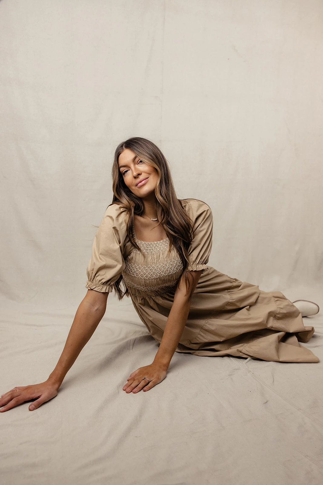 The Grayce features puff sleeves, a smocked bodice, and best of all, pockets! This dress can be worn all year long and dressed up or down with your favorite shoes. Emulate style and grace with this lovely taupe dress.ย