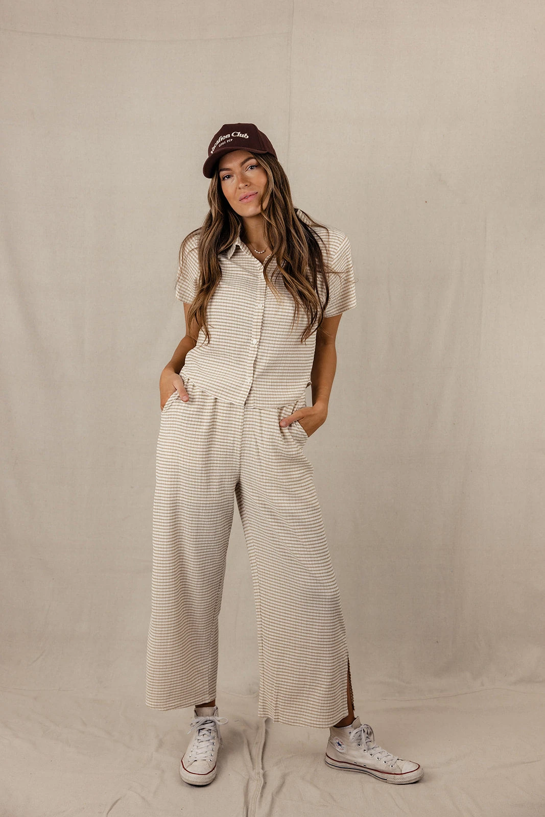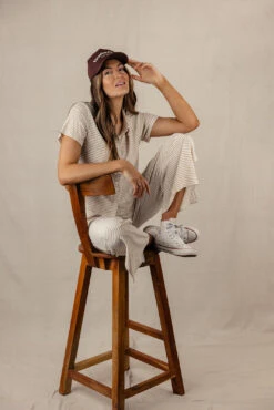 // paired with the kyla striped pants + vacation club canvas trucker hat in saddlebrown