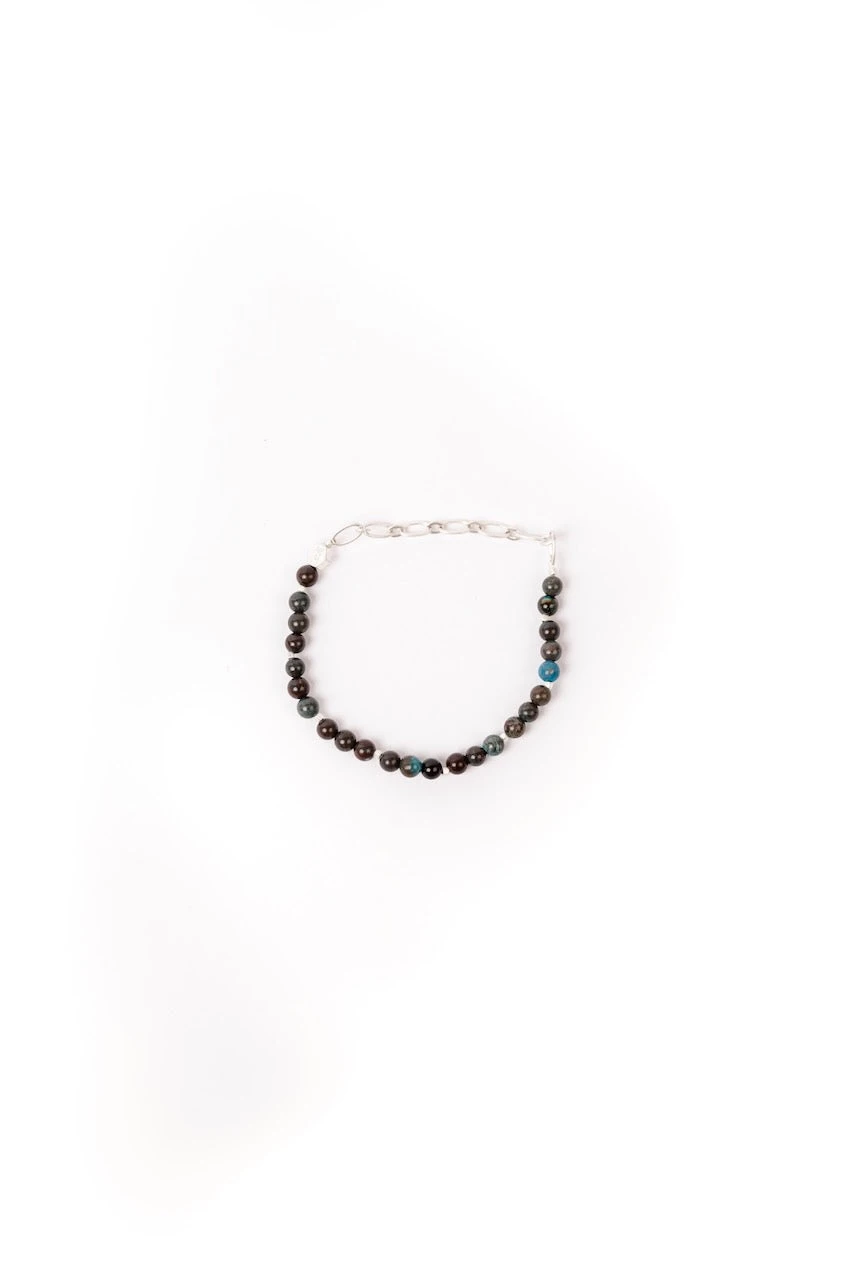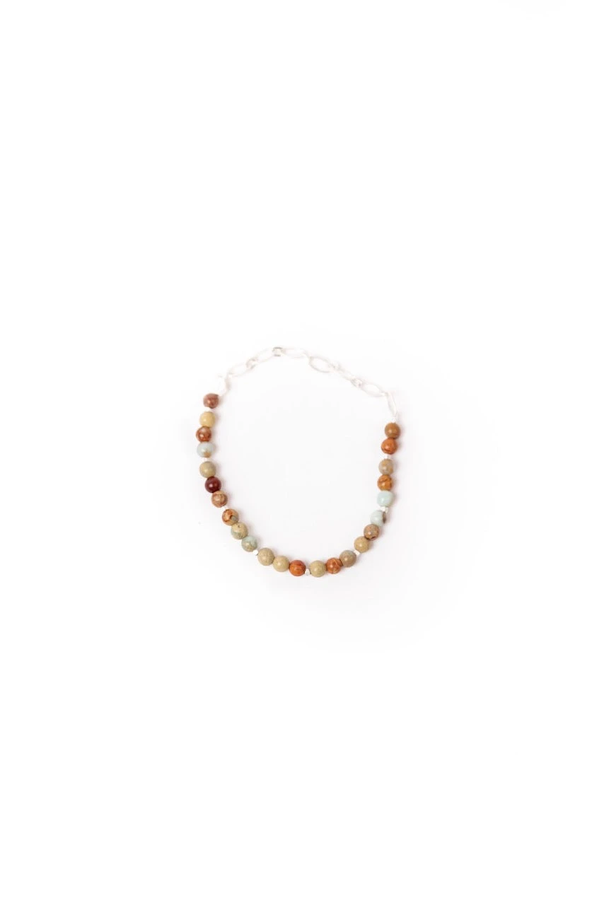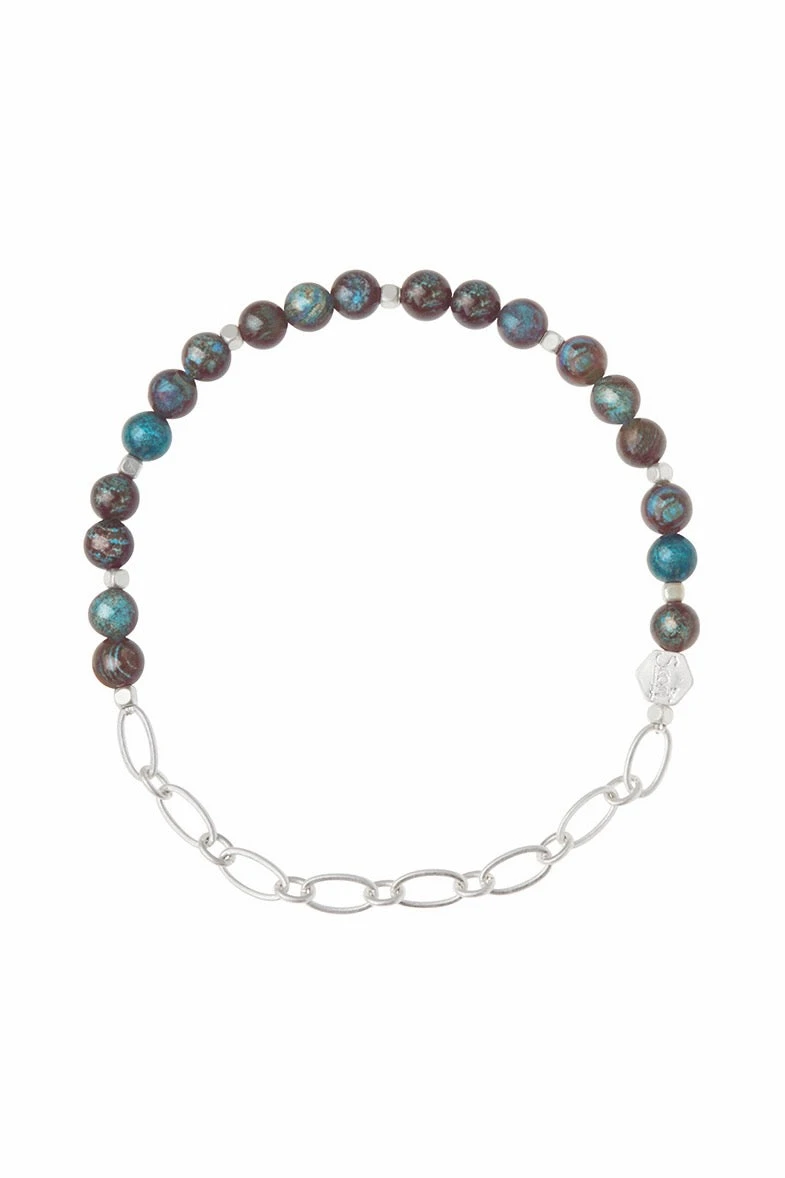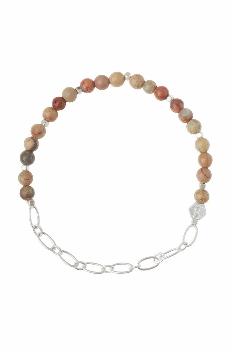 - Materials: 4mm semi-precious round stone beads, brass chain, logo bead, and stretch cord.