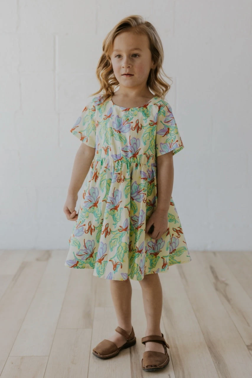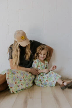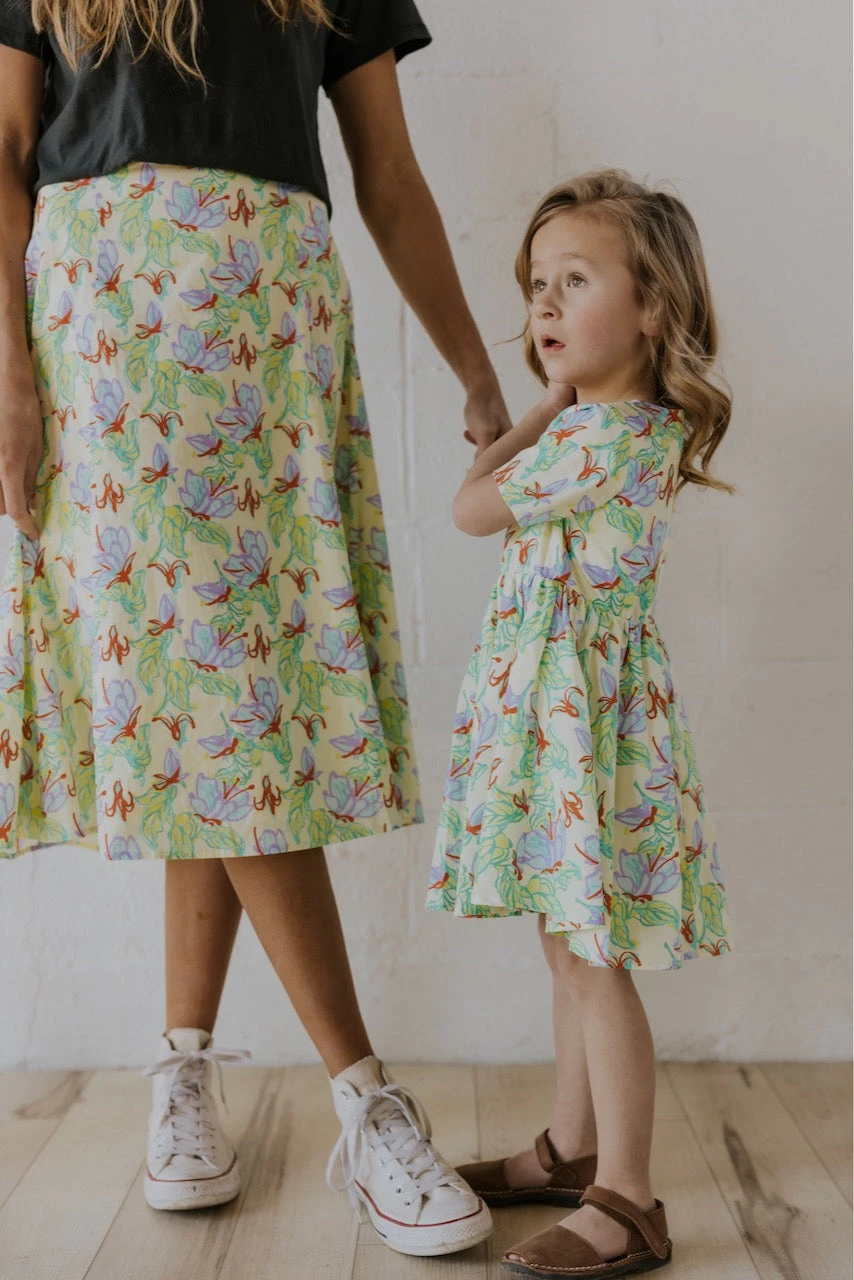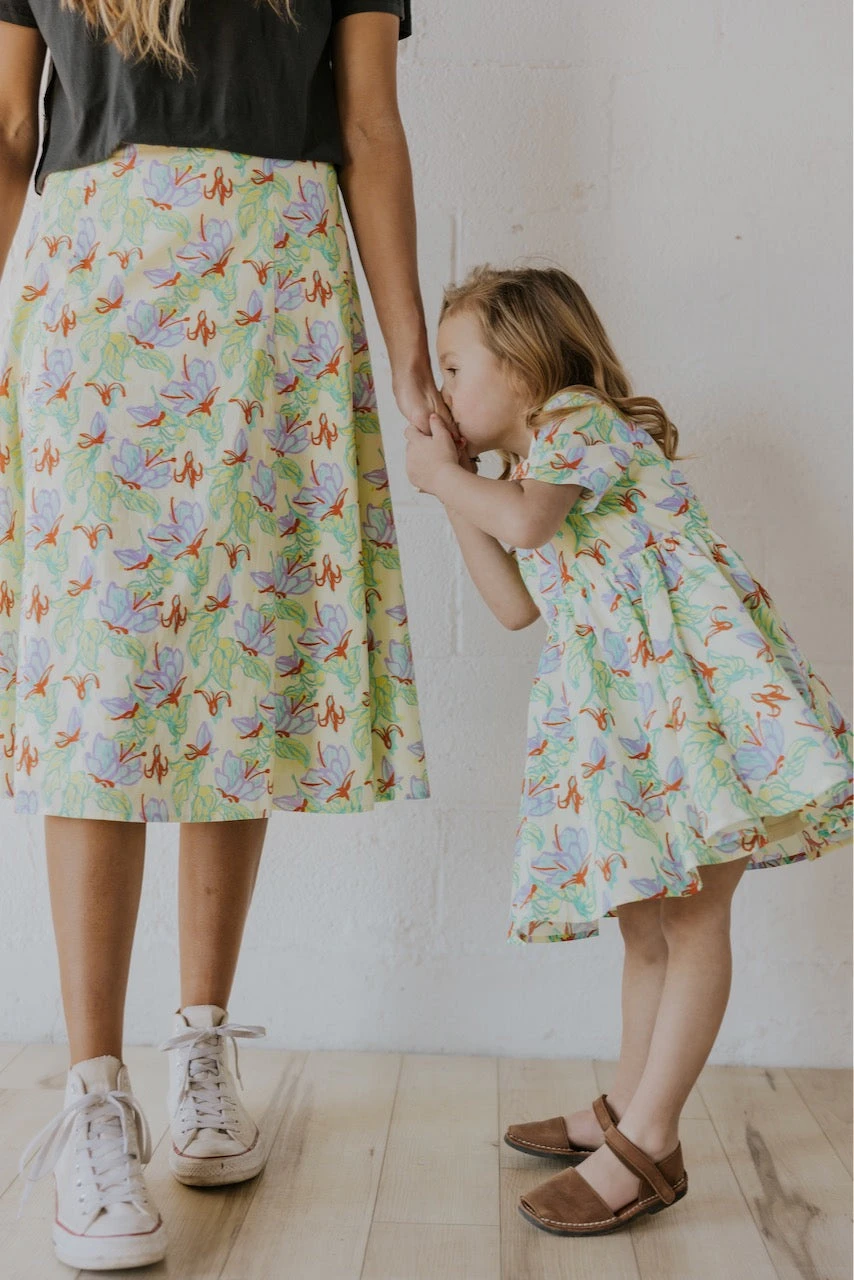 Oh, springtime, do serenade us anytime you feel like showing up. This dress can only wait so long before she gets featured in every household. I mean, just picture this dress with sneakers or sandals. The light yellow base with vibrant floral + red details brings this cutie into our top ten favorites this season. Especially when paired with the matching skirt for mom 🙂