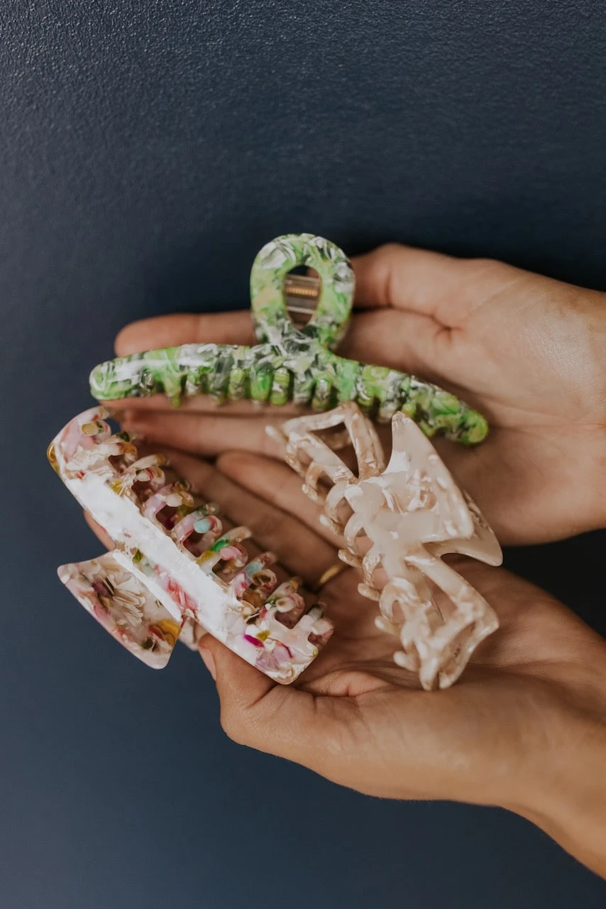 The cutest claw clips of the season are finally here! They look so pretty with every hair color + will add a subtle touch of femininity to your look. This set features 3 clips, one green, one cream, + one multicolor!