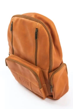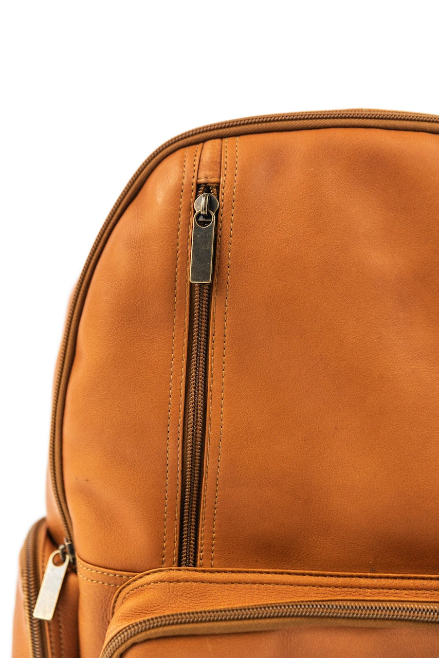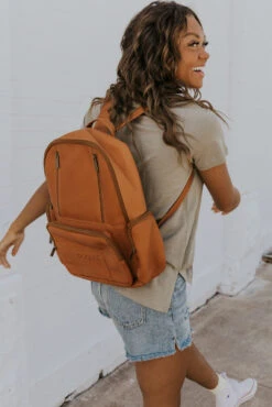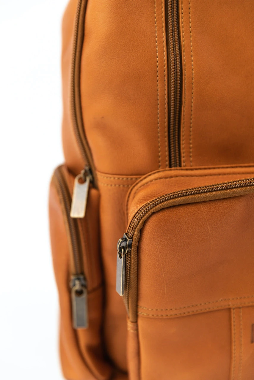 Hey look at this leather backpack! This backpack is camel color with multiple zipper pockets. Get this stylish bag for your fun summer trips or daily routine!