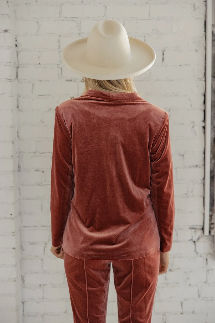A vision in velvet. This expertly tailored blazer enhances the female form with a nipped waist and lightly padded shoulders. Understated detailing includes a notched lapel and a single button closure. Style this jacket with the coordinating pants for an effortlessly cool suiting moment—perfect for a job interview or an evening out.