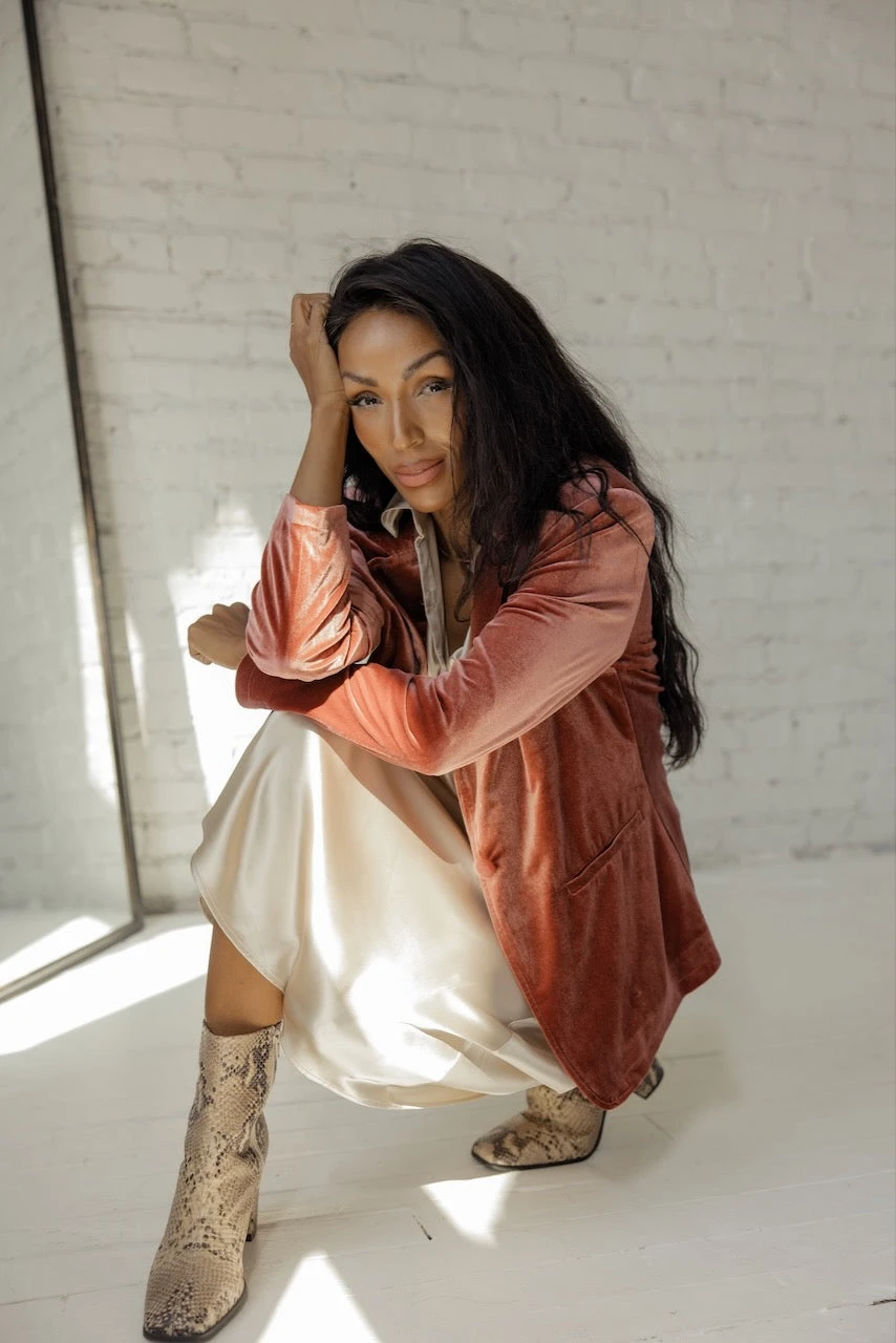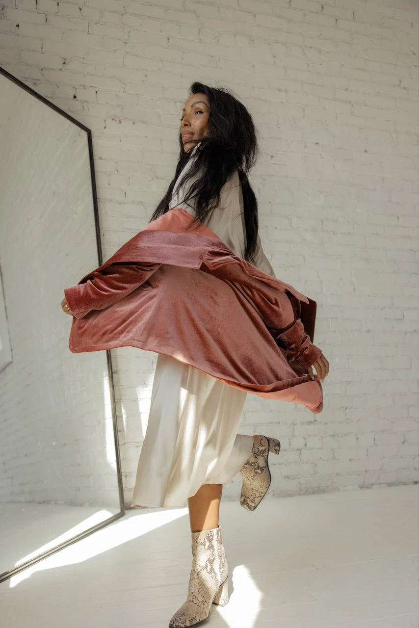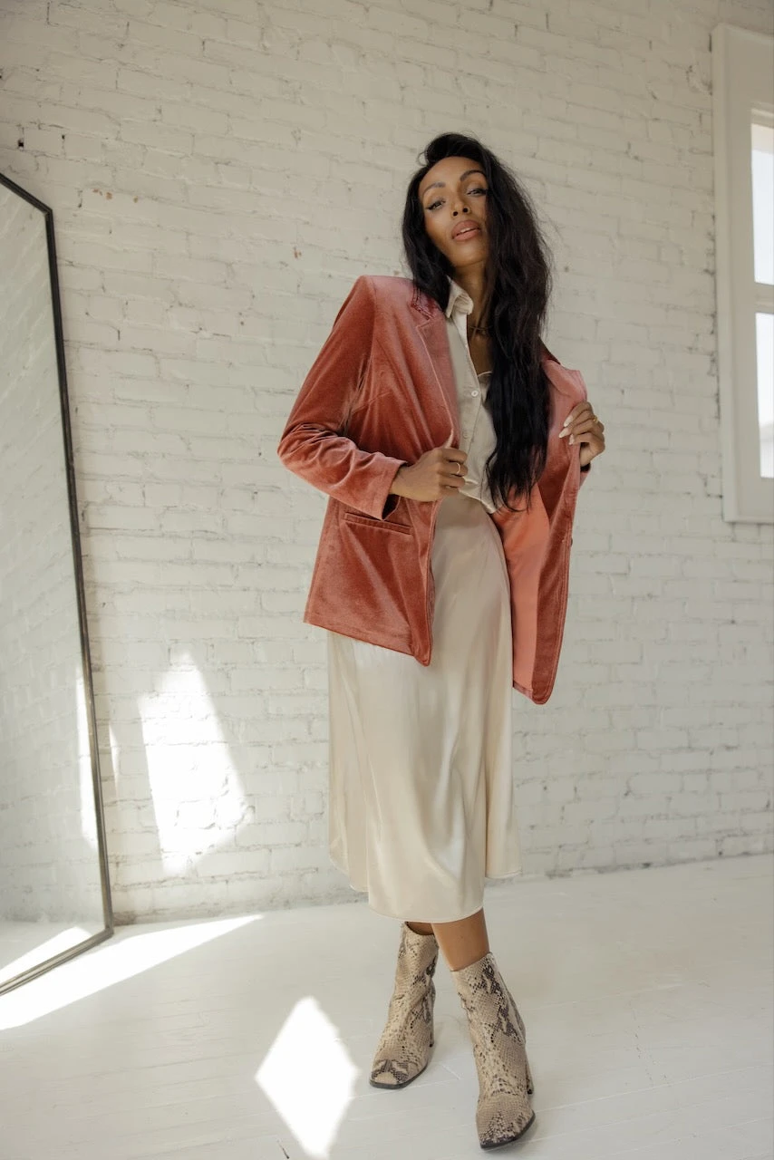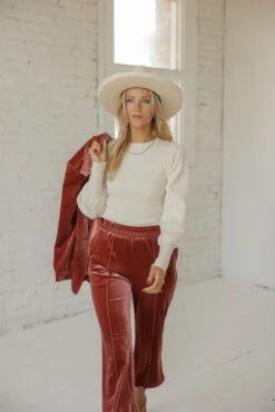 // paired with the salt gable estates button up blouse, salt gable estates midi slip skirt, free people sienna ankle boots in dimgray, salt westgate velvet suit pants, + everly balloon sleeve sweater in ivory
