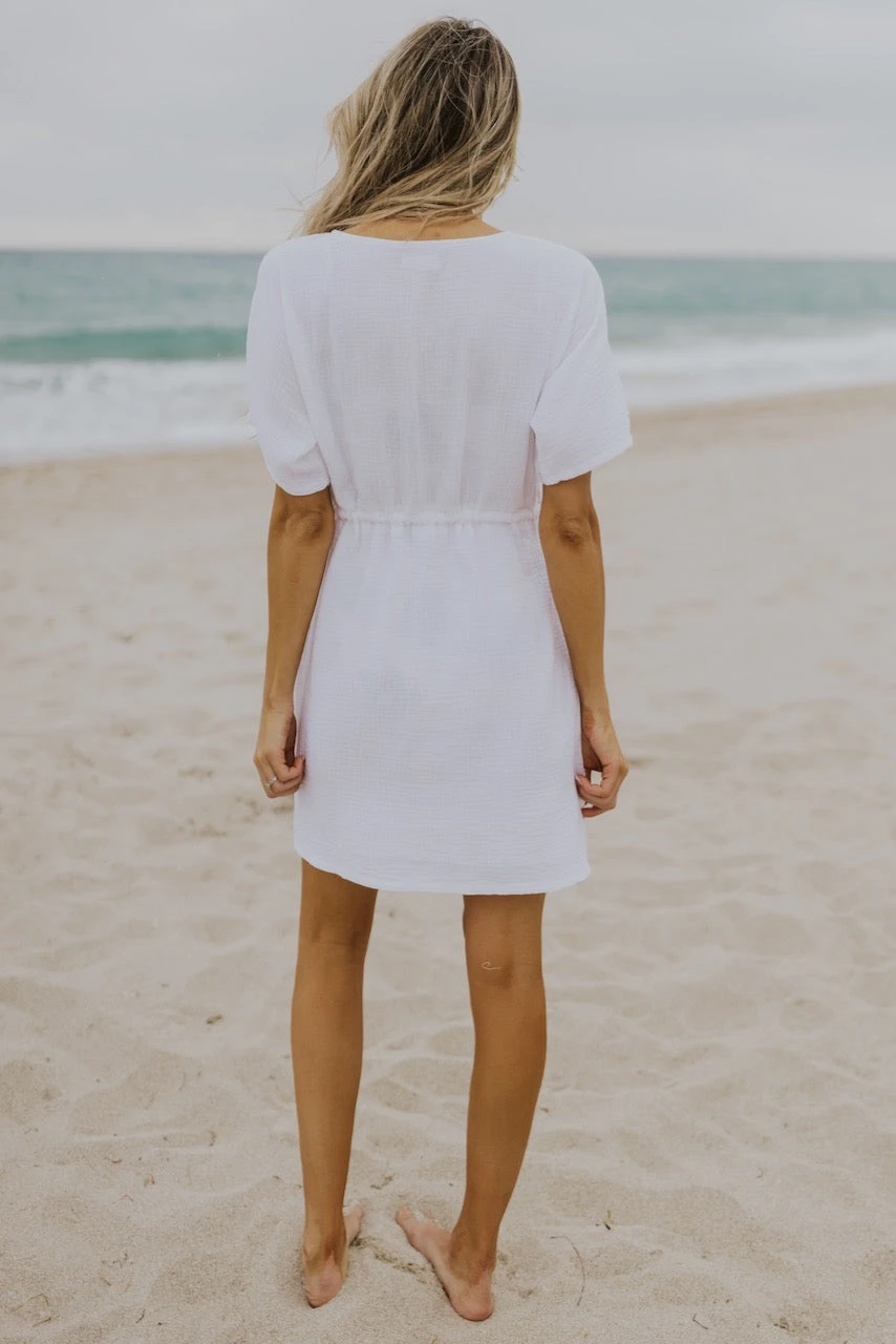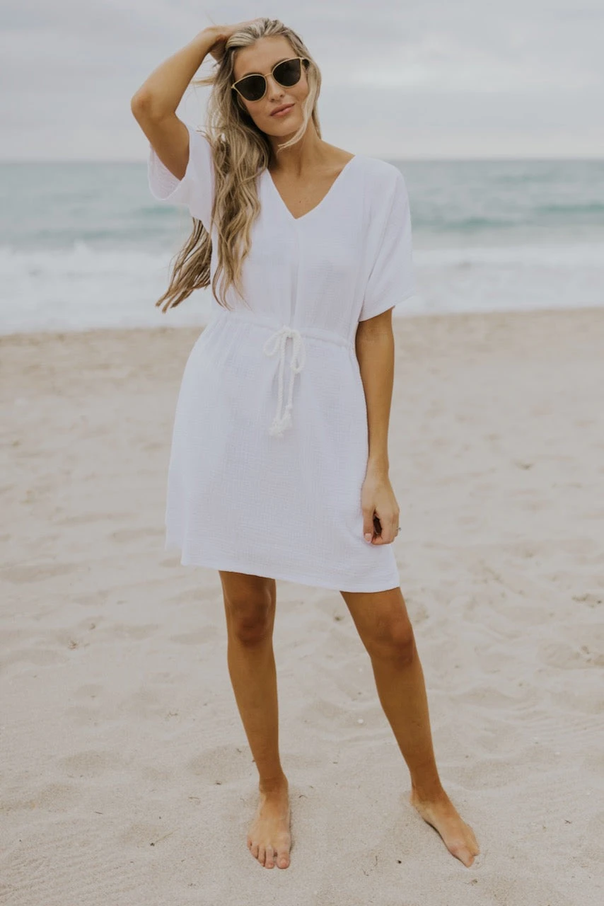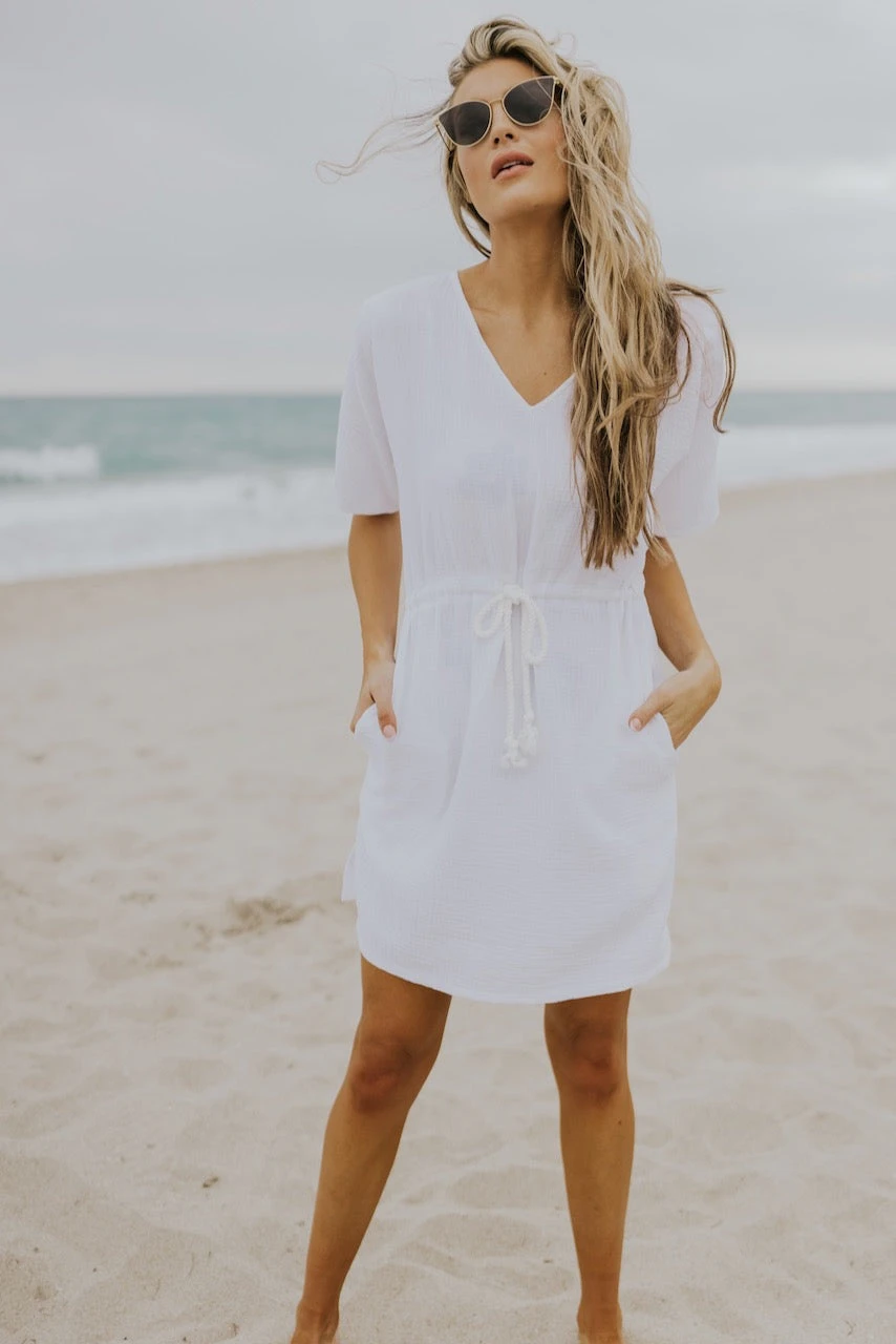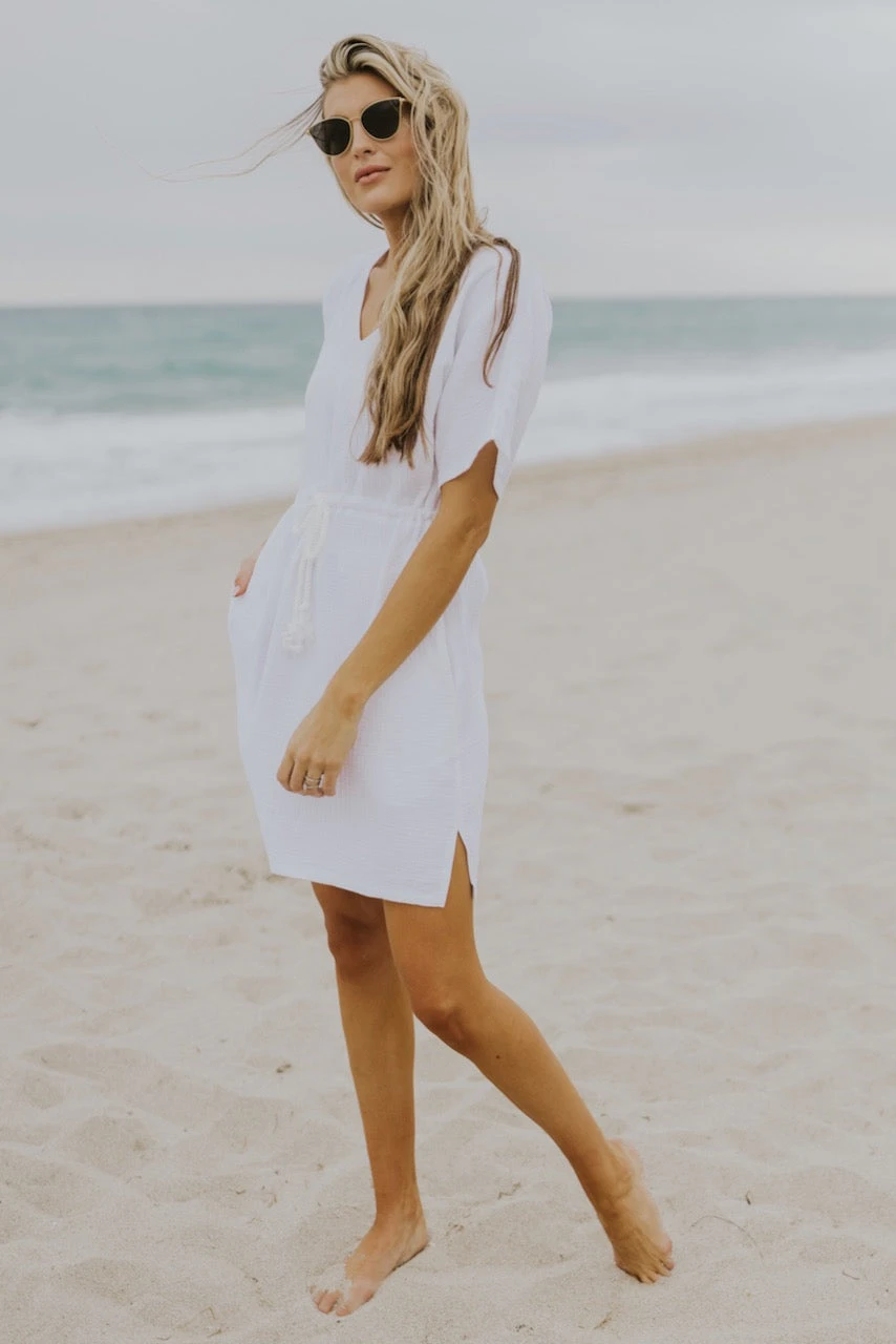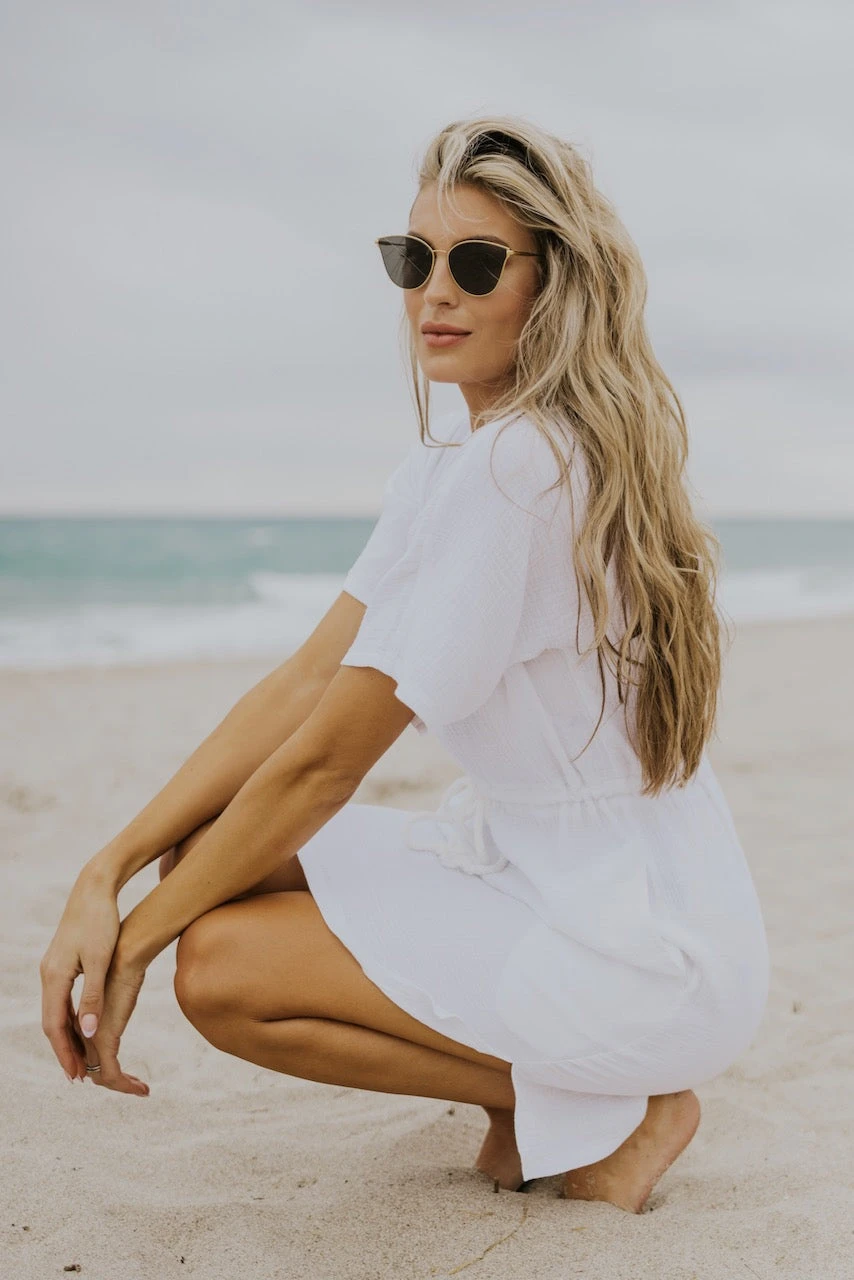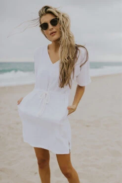 I know summer means shorts + oversized tees, but sometimes a cute cover-up is exactly what you need. This swim cover features so many details we know you will love! A functional drawstring tie, pockets, a flattering v neck, textured material, modesty when you want it, and flirty side slits—everything you didn’t know you needed!