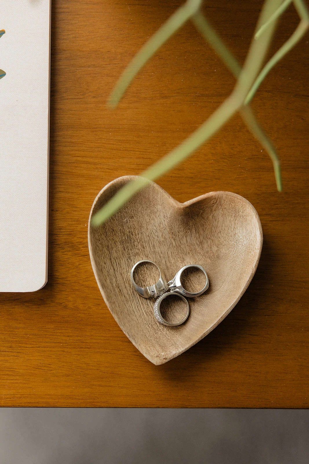 Perfect for holding jewelry, keys, or other small treasures, this mango wood dish adds a touch of cuteness and love to any space.