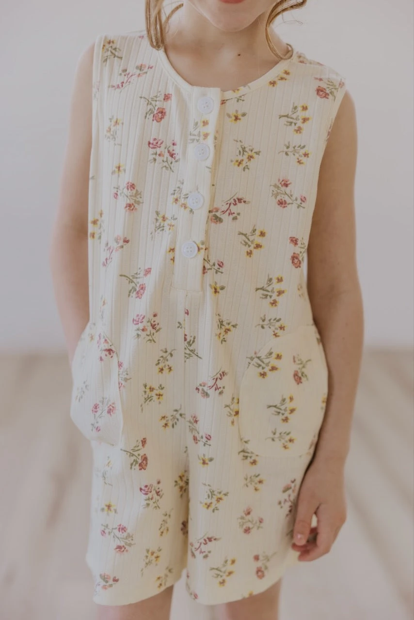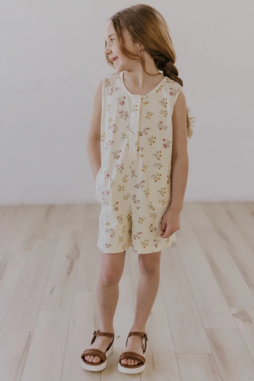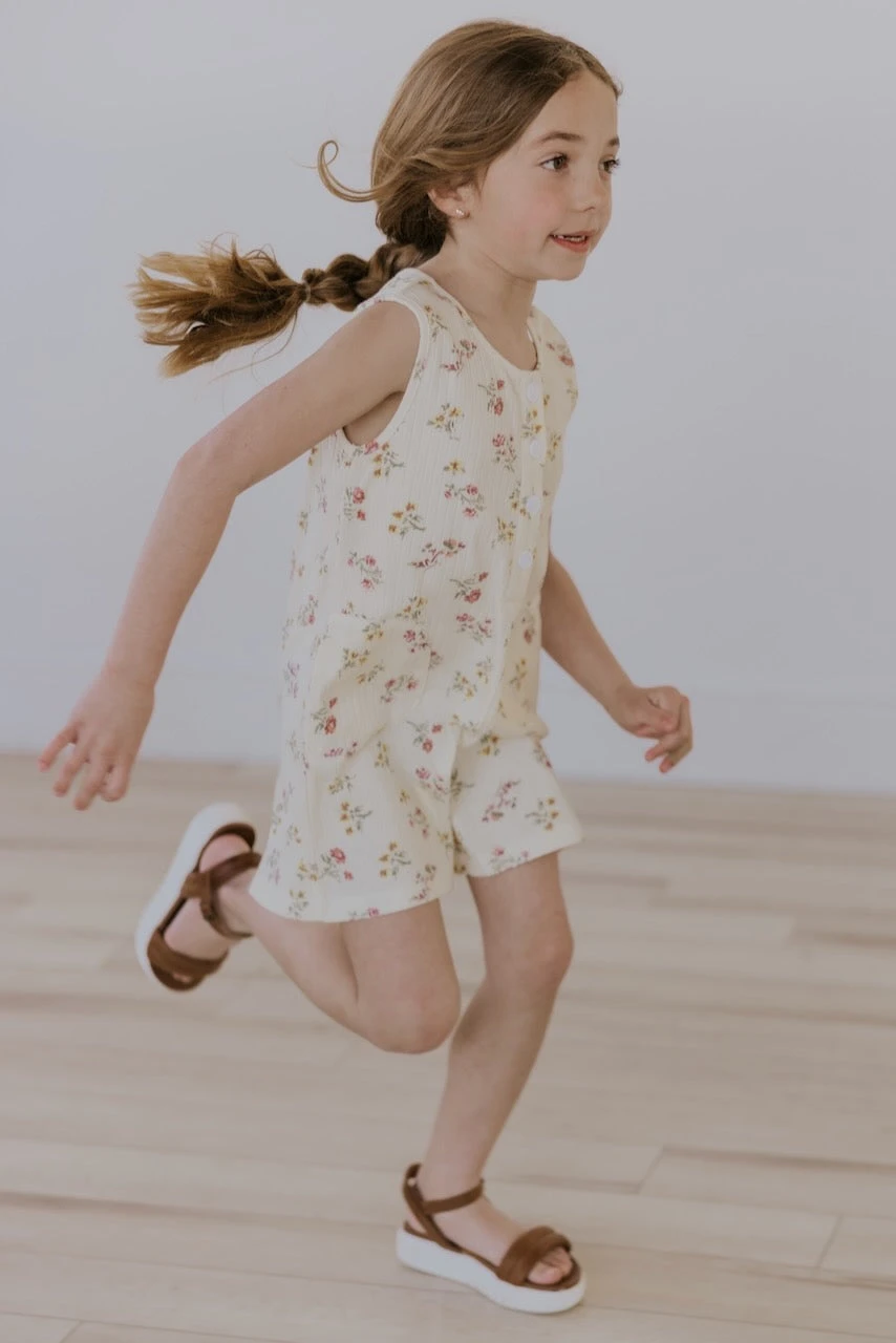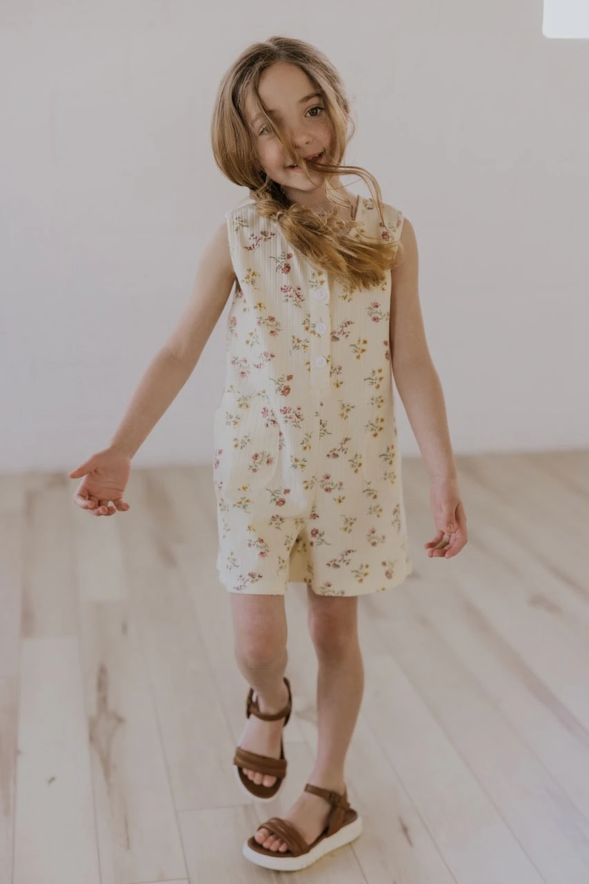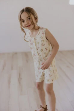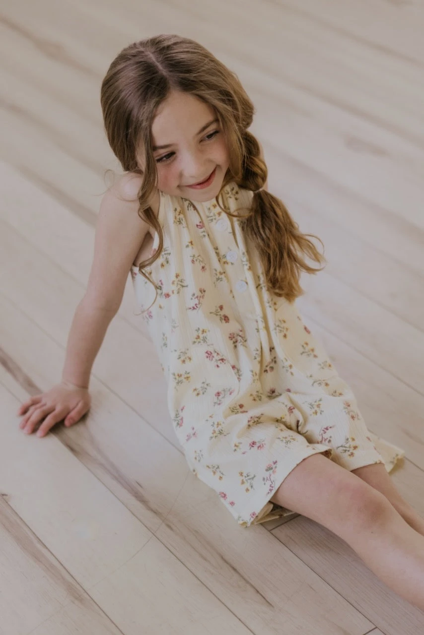 This one is going to be trifficult to leave behind. Featuring gorgeous floral material, Henley style front buttons, and tank sleeves. Complete with pockets for your little ones treasures they find on their journey. Pair her with a cardigan and sneakers and your little one will be ready for anything. Including playing grannies and slipping on beans 🙂