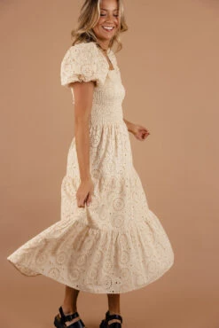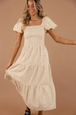 Picture this: you, this dress, and an endless field of wildflowers. I can totally see it. The Cambridge Eyelet Midi is a dream with its tiered skirt, puff sleeves, square neckline, and smocked bodice. Effortlessly romantic and perfect for any summer occasion, this dress will make you feel like a goddess wherever you go.