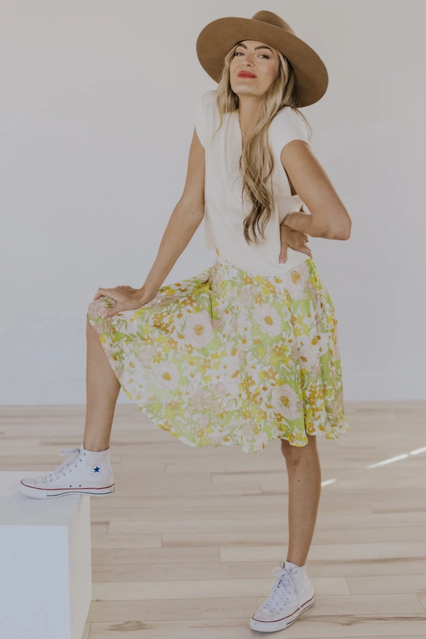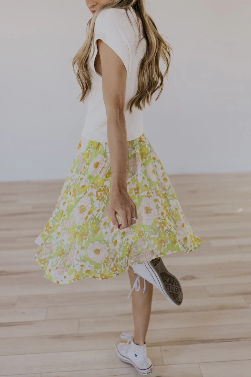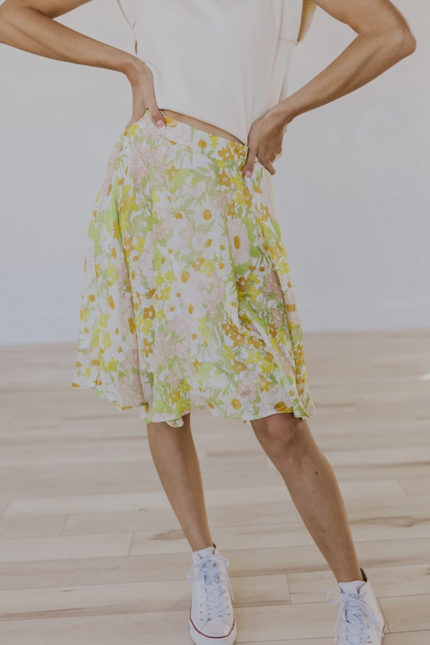 Vacation. Pool. Beach. Girls night. Date night. This floral beauty does it all. With a groovy orange, light pink, + green floral design, this knee-length skirt is flowy + cool while still being completely chic. Some might call it an icon or a legend. And what this skirt isn’t, is a myth. And it’s not a myth that we have a matching dress for your little one too!