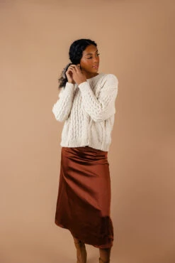 This sweater is a true work of art, featuring a beautifully intricate cable knit with a charming braided pattern. Designed with a boxy fit, this sweater embraces comfort without compromising style. It’s the ideal piece for those who appreciate a relaxed, laid-back look without sacrificing warmth and coziness.