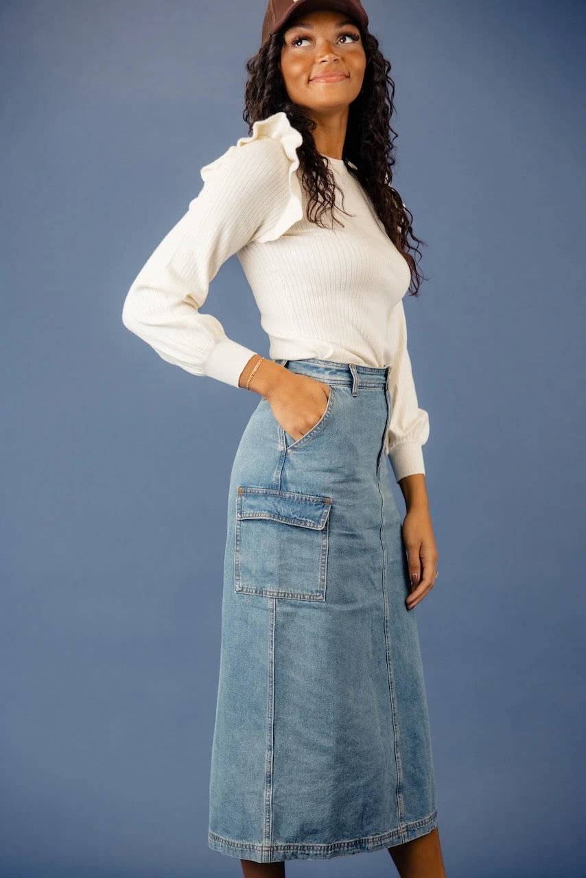 This long denim skirt brings us back to the 90’s – in a good way! Featuring cargo pockets at the hips and a slit in the back for easy movement, this skirt will pair with tees, sweaters, and your favorite jackets this winter!