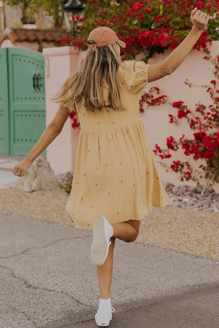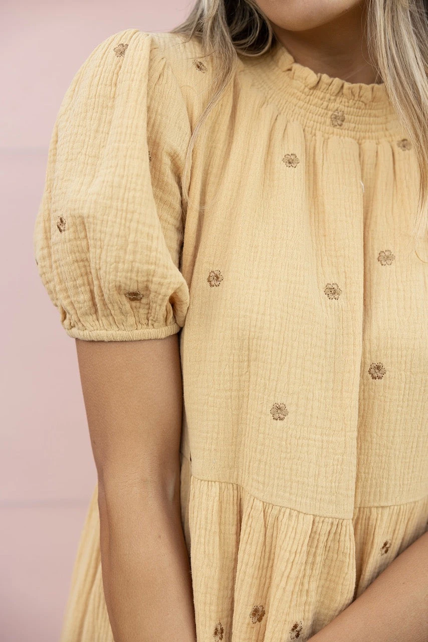 Complete with darling puff sleeves + embroidered flowers, this dress is a must-have. The casual silhouette is perfect for either a day at the zoo or a date night. Plus, the smocked neckline allows for easy on and off. Pair her with sneakers + a baseball cap, or sandals + a cardigan to dance your way through the seasons 🙂