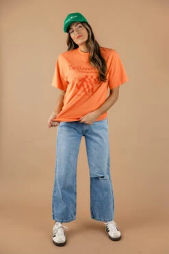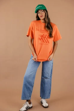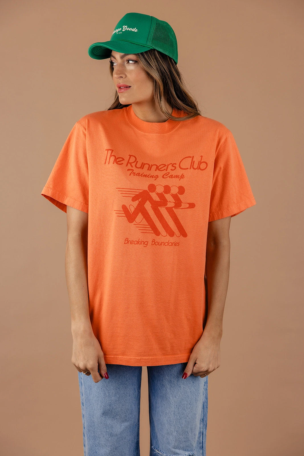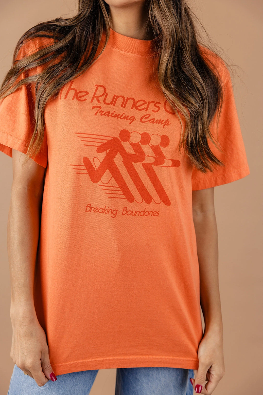 The perfect tee for all those girlies in their running era. Featuring a bright orange graphic and an oversized fit, this tee is one you will reach for all summer!