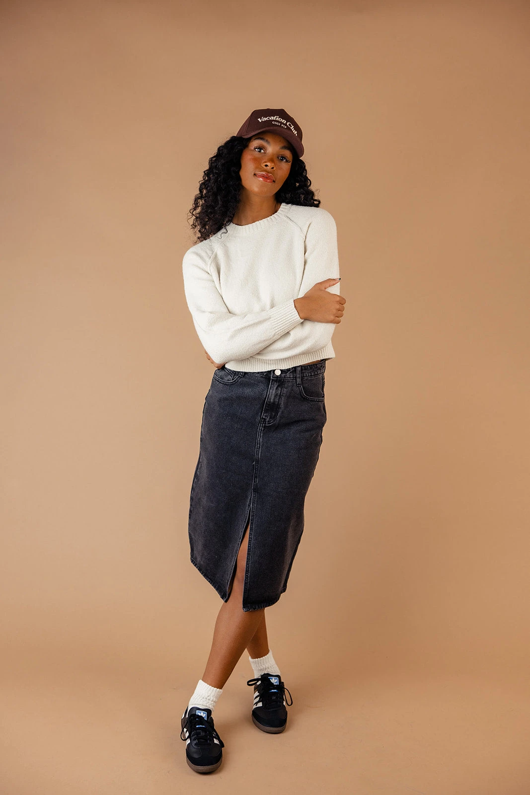 This trendy denim skirt features the perfect length and a fun center slit. It’s easy to pair with any sweater or tee in your closet and keeps you comfy all day long!
