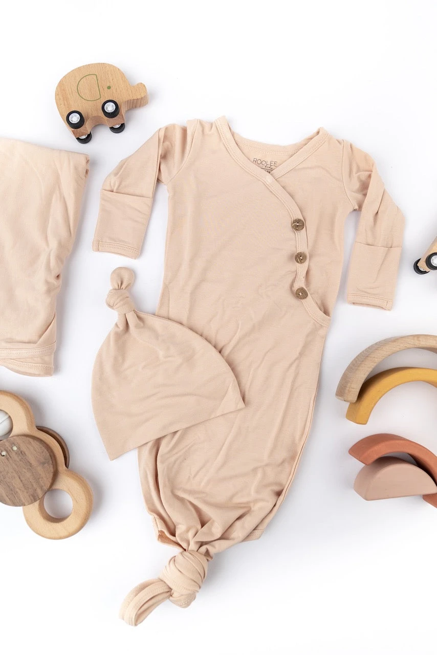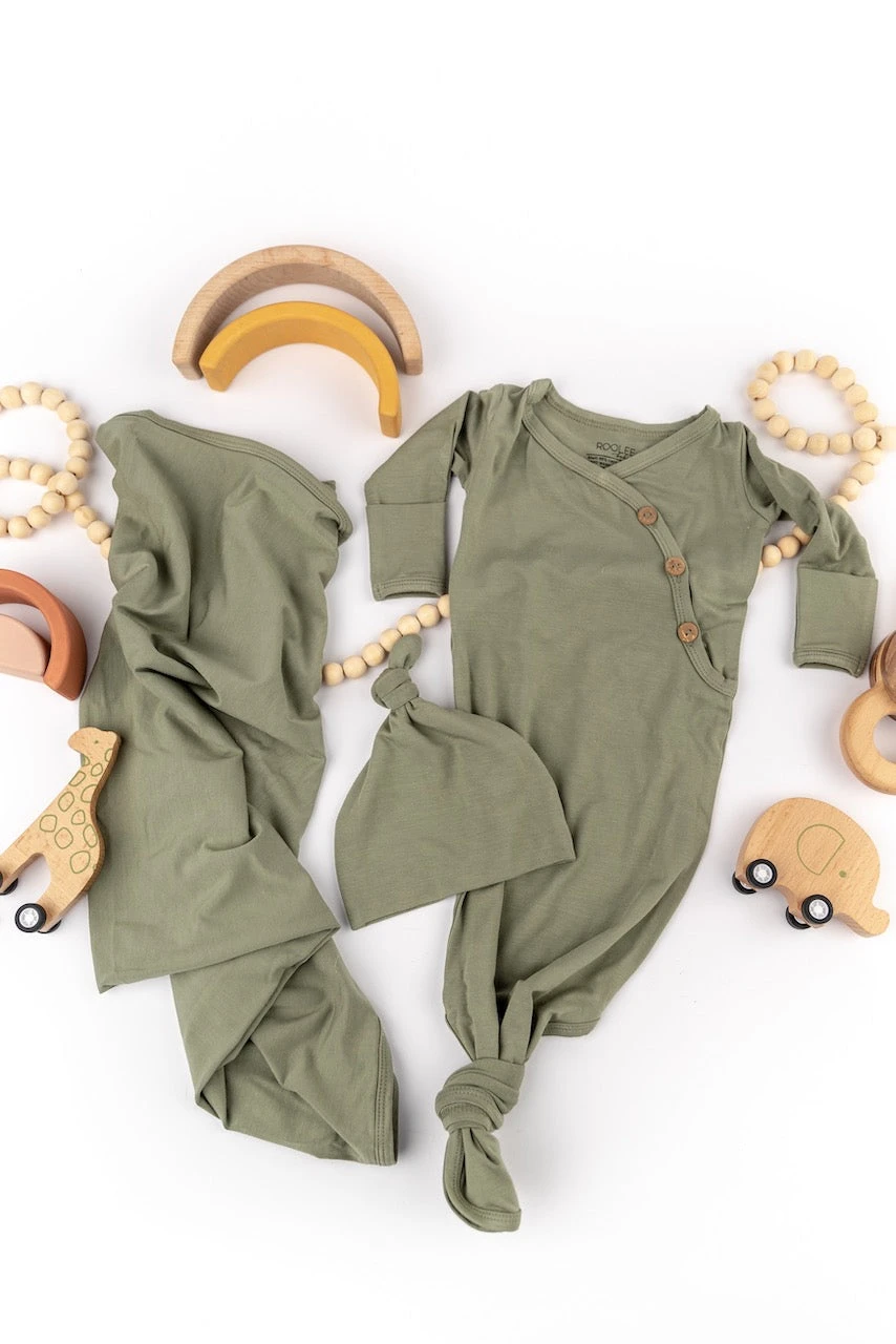 - Bundle includes a newborn cap, knot gown, and swaddle blanket