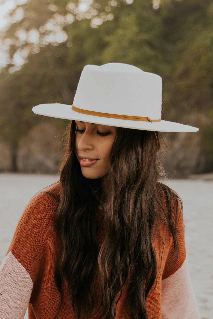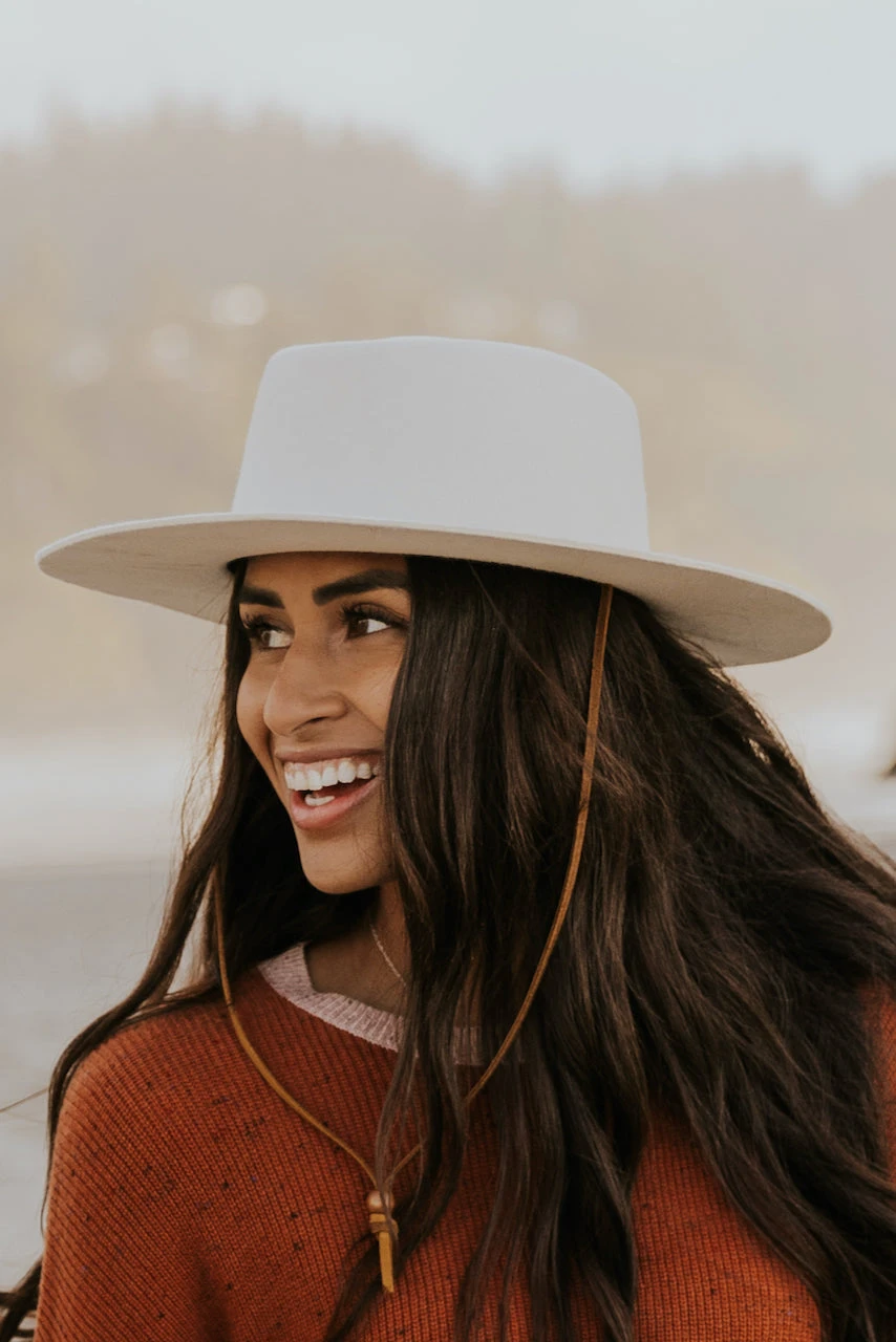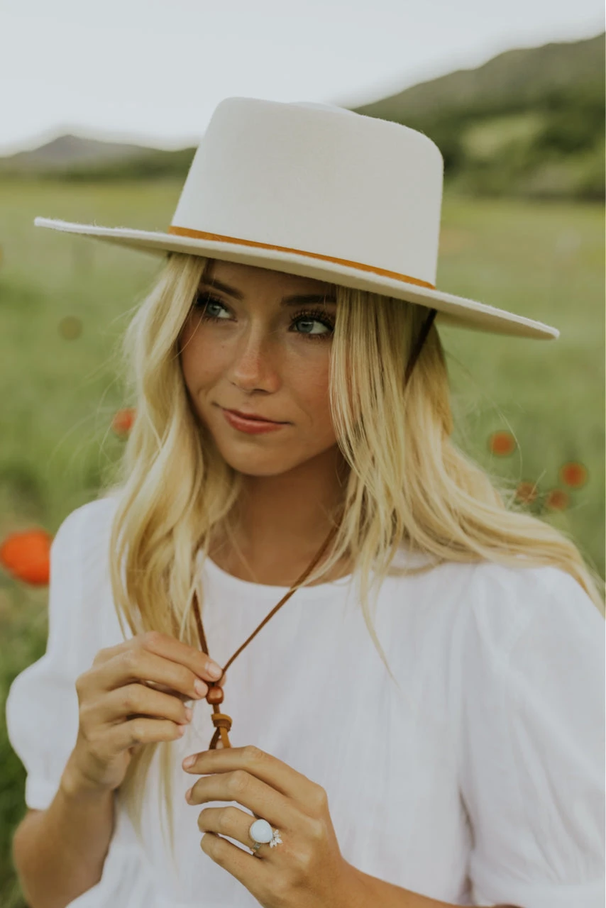 Introducing the Wren – designed with your lifestyle in mind! This flat brim, round top off white hat features a dipped telescope crown adorned with a genuine leather chin strap – to take this hat to the next level! The Wren proves comfort can be stylish and that it’s the details that really matter.