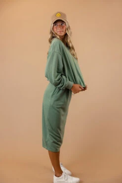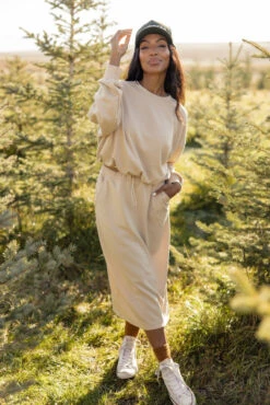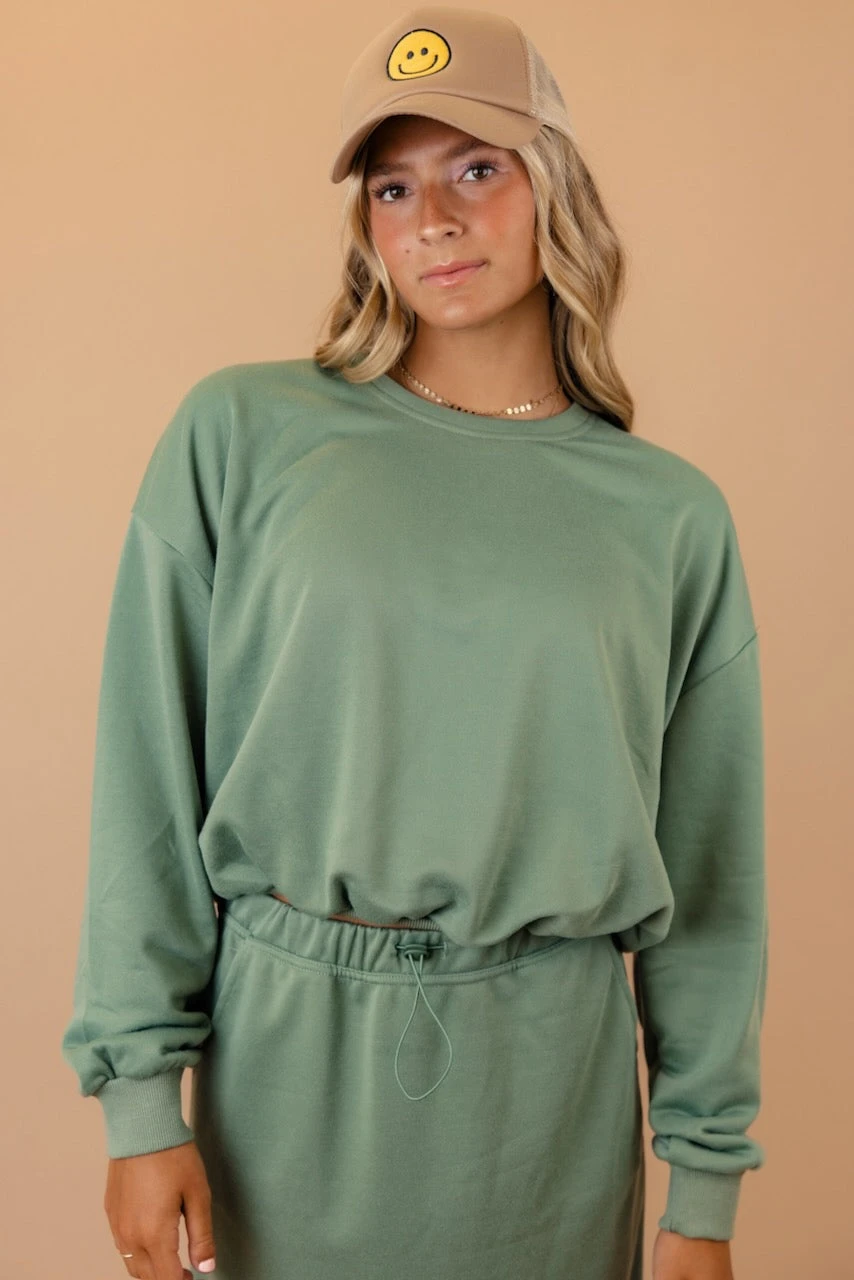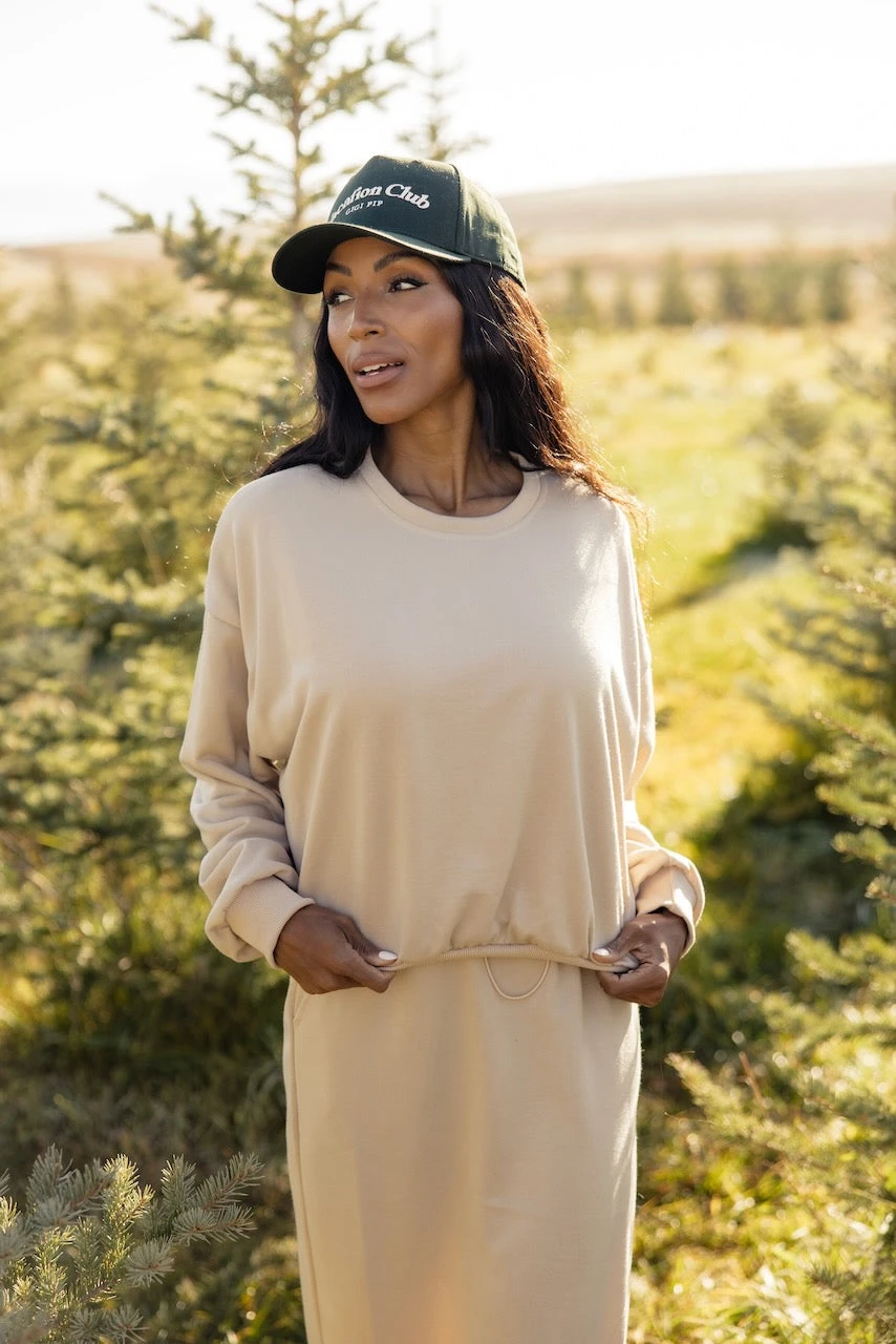 Both versatile and comfortable, this take on the classic pullover features a relaxed fit with a gathered waist and drop-shoulder full-length sleeves. With a waistband designed to fit not too high or low–but just right, this pullover can be worn with bottoms of choice, or paired with the matching skirt.